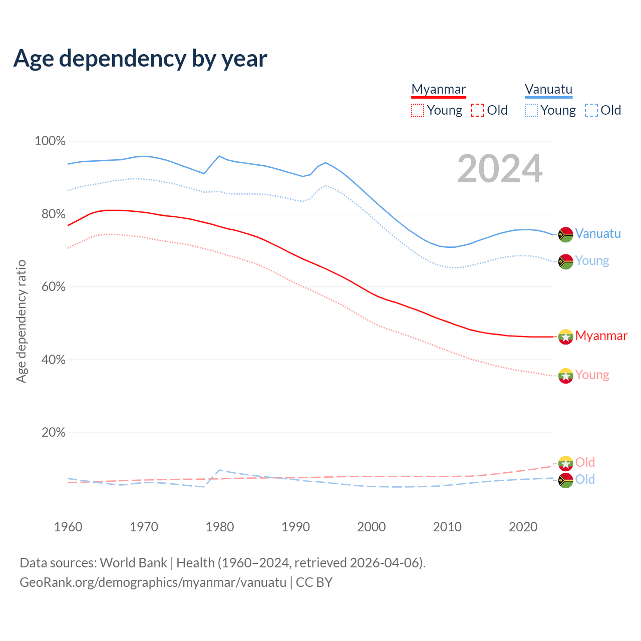 - Myanmar is ranked 96/196 by median age (oldest to youngest) vs 156/196 for Vanuatu.