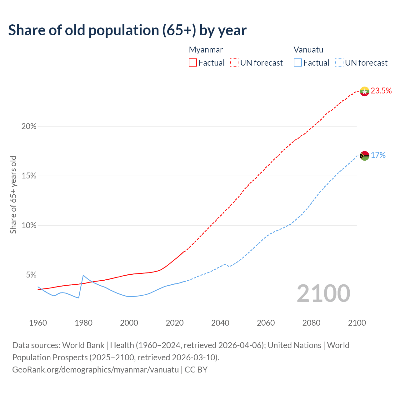 The share of older people aged 65 and over is 7.3% in Myanmar and 4.3% in Vanuatu. Life expectancy in Myanmar compared to Vanuatu .
