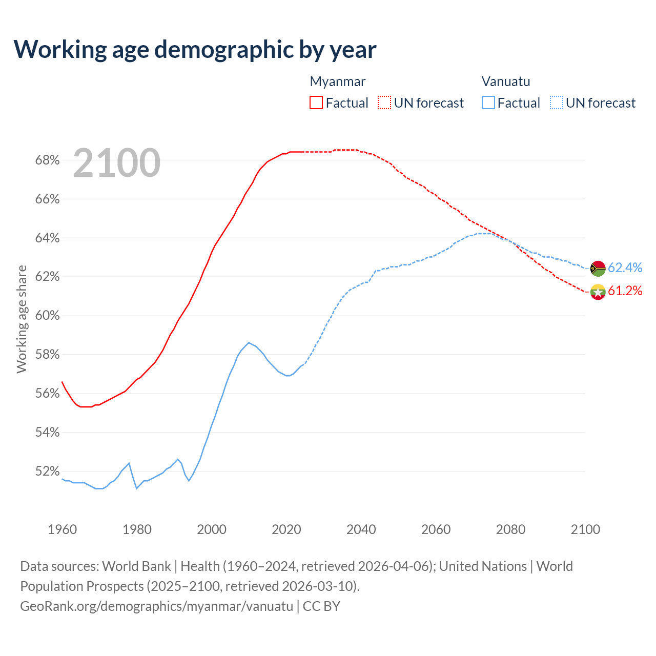 - Myanmar has 37.8M working age adults (aged 15-64) vs 198K in Vanuatu.