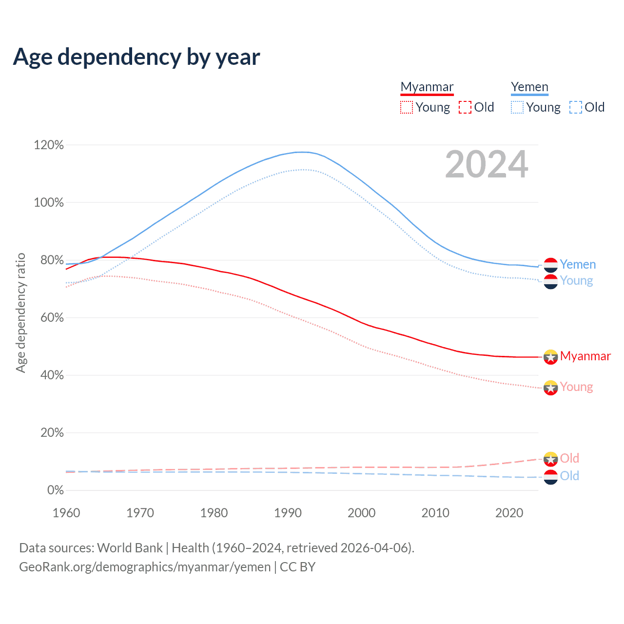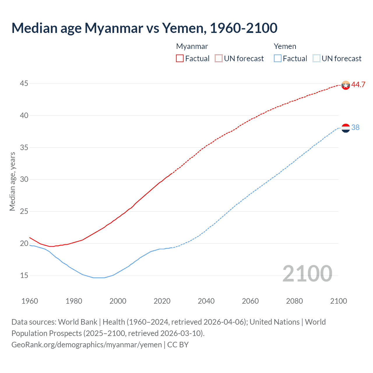 - Myanmar is ranked 96/196 by median age (oldest to youngest) vs 174/196 for Yemen.