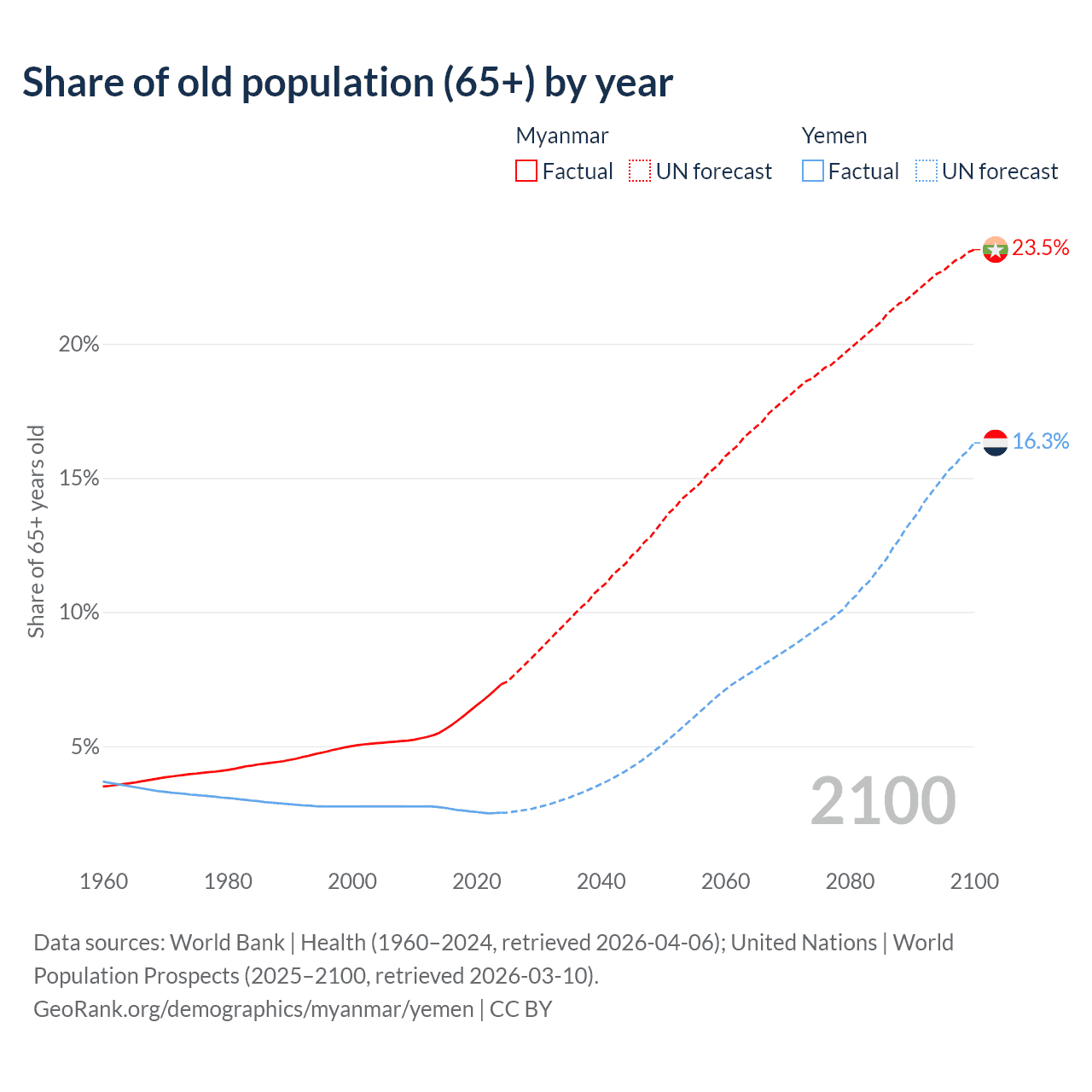 The share of older people aged 65 and over is 7.3% in Myanmar and 2.52% in Yemen. Life expectancy in Myanmar compared to Yemen .