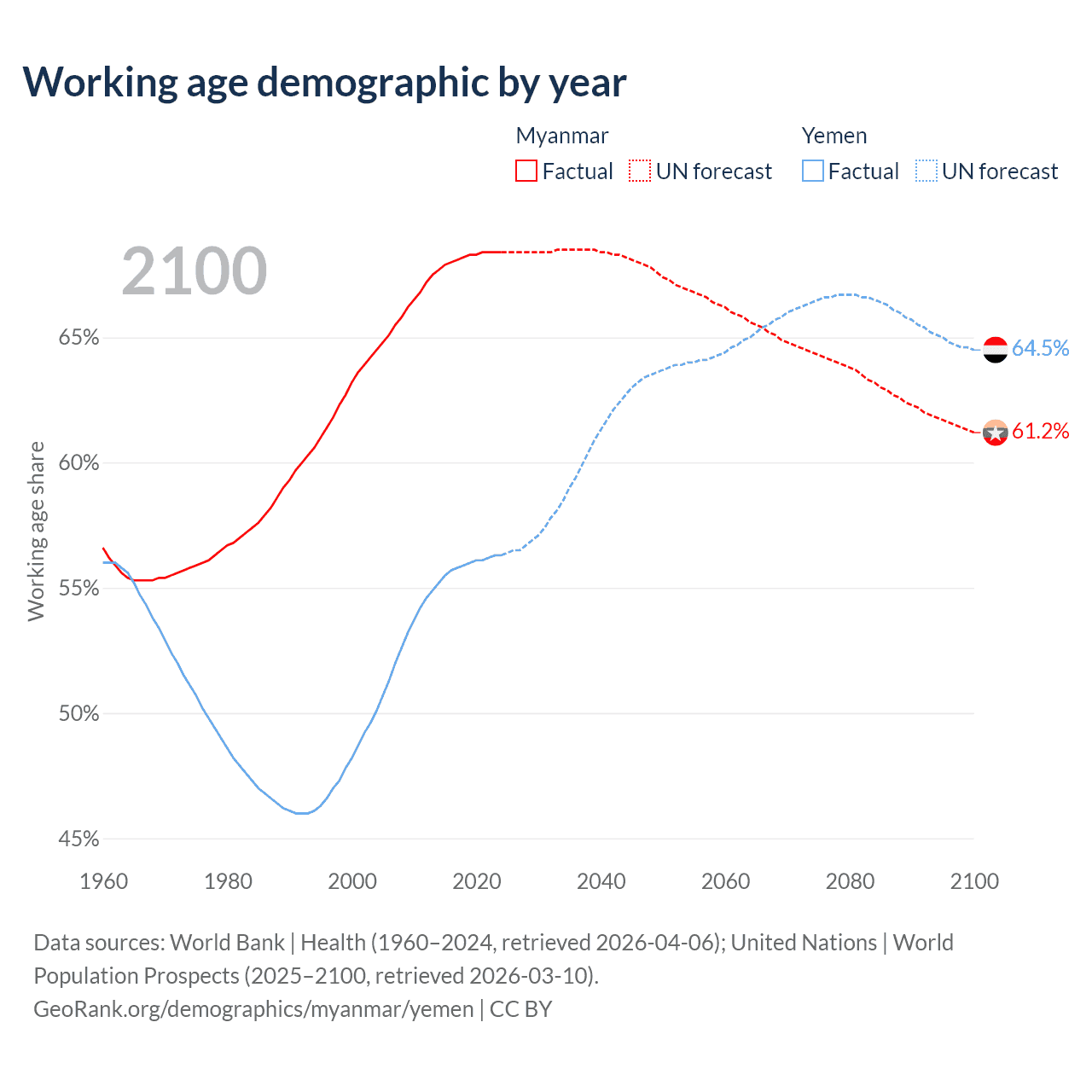 - Myanmar has 37.8M working age adults (aged 15-64) vs 24.4M in Yemen.