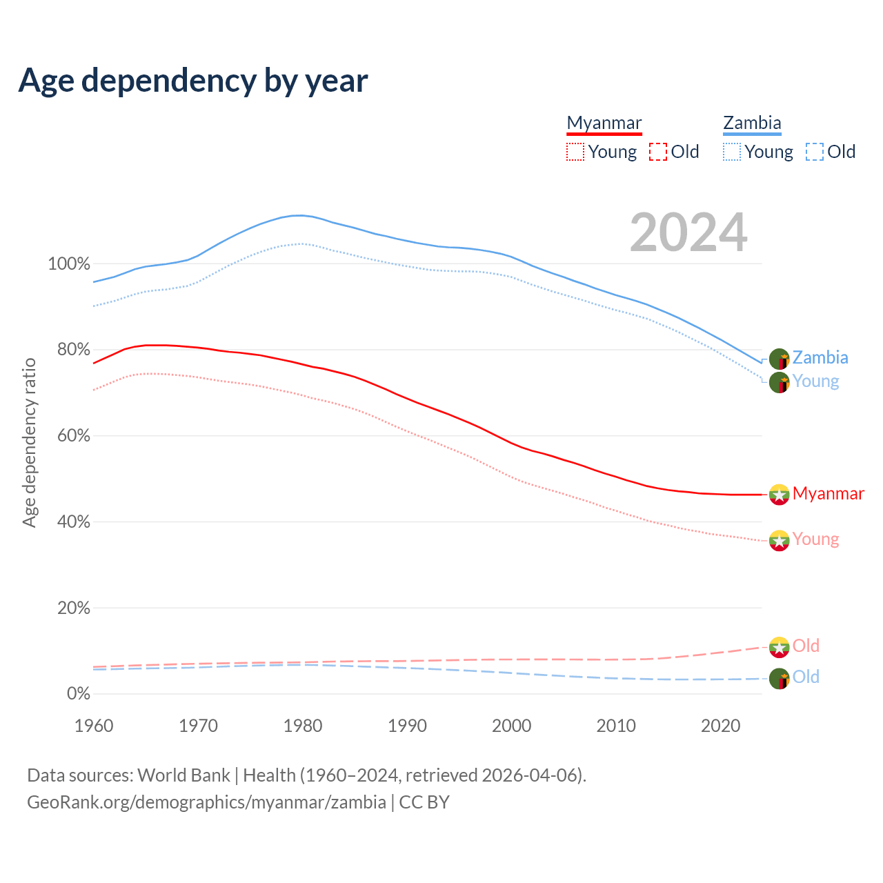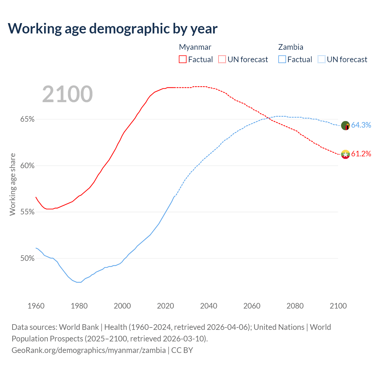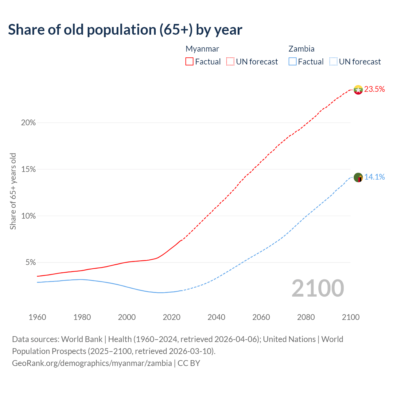 The share of older people aged 65 and over is 7.3% in Myanmar and 1.95% in Zambia. Life expectancy in Myanmar compared to Zambia .