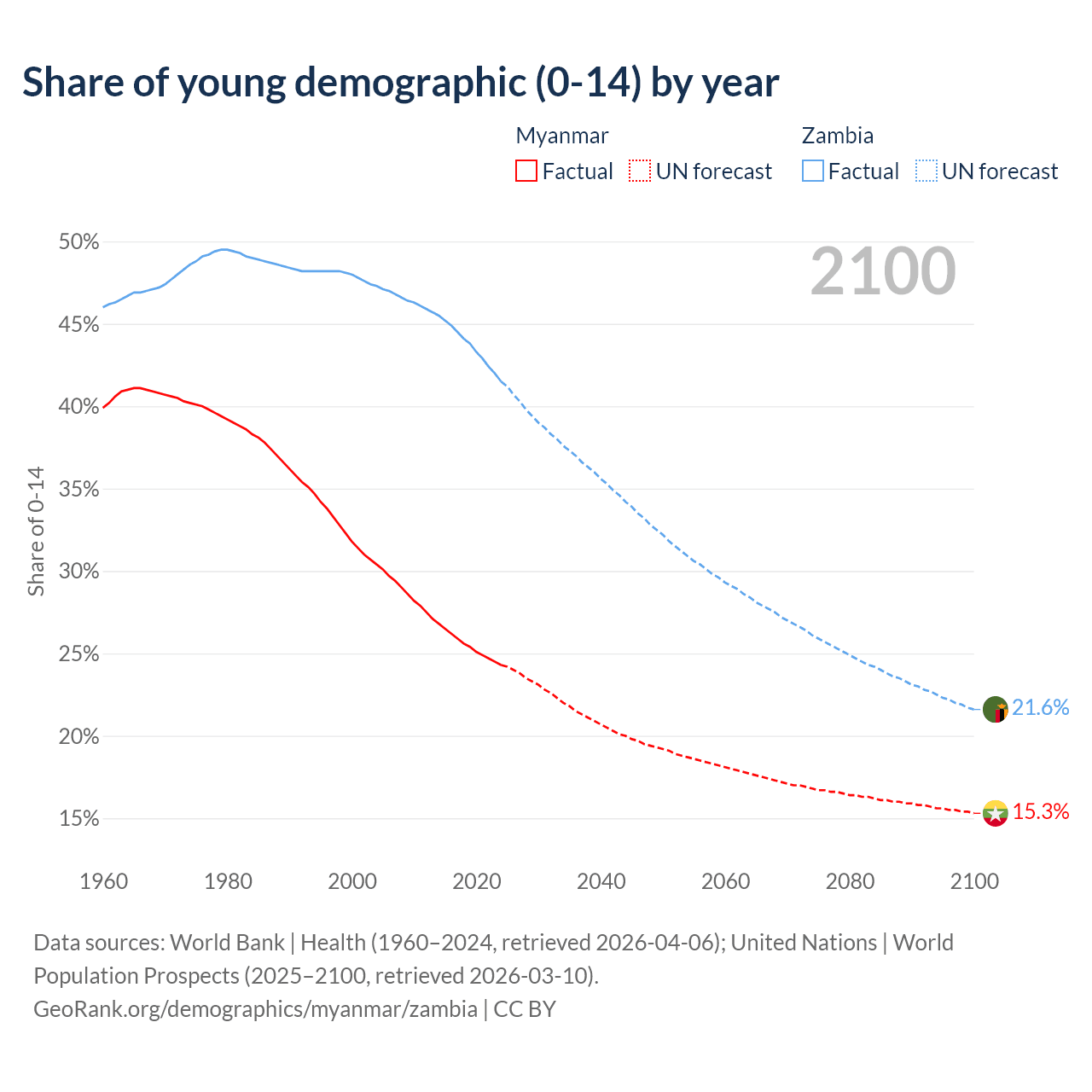 - As of 2026, the population of Myanmar is 55.3M vs 22.7M in Zambia - 2.44 times difference.