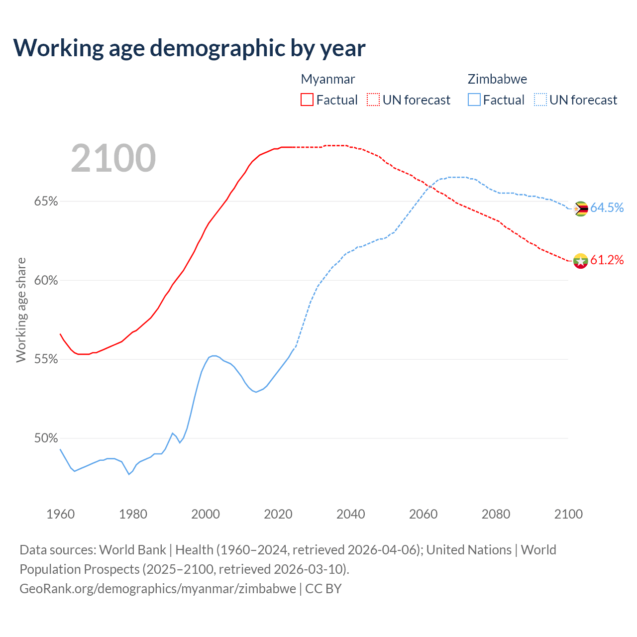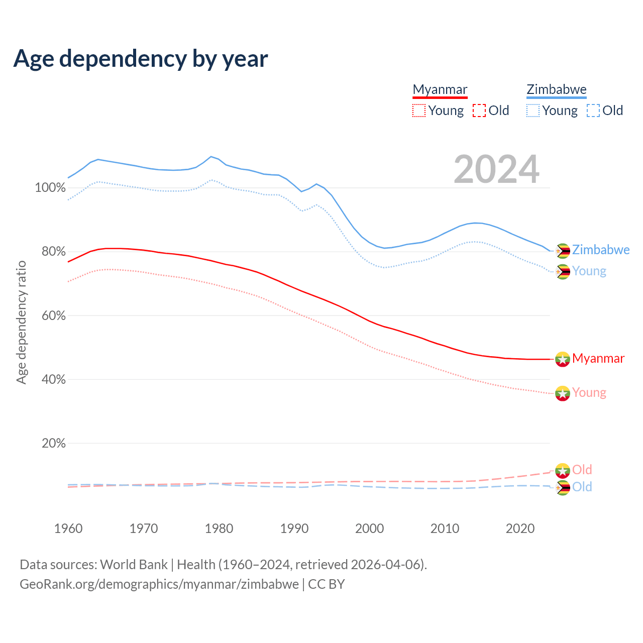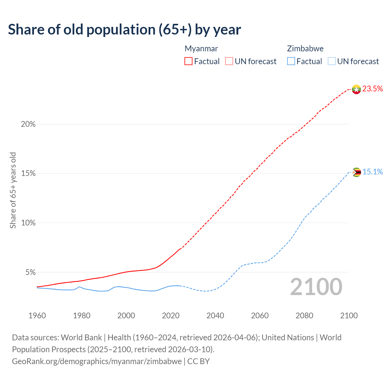 The share of older people aged 65 and over is 7.3% in Myanmar and 3.6% in Zimbabwe. Life expectancy in Myanmar compared to Zimbabwe .