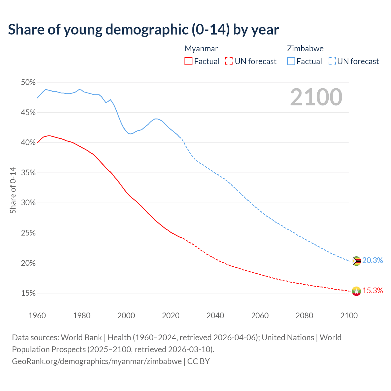 Median age Myanmar vs Zimbabwe, 1960-2100