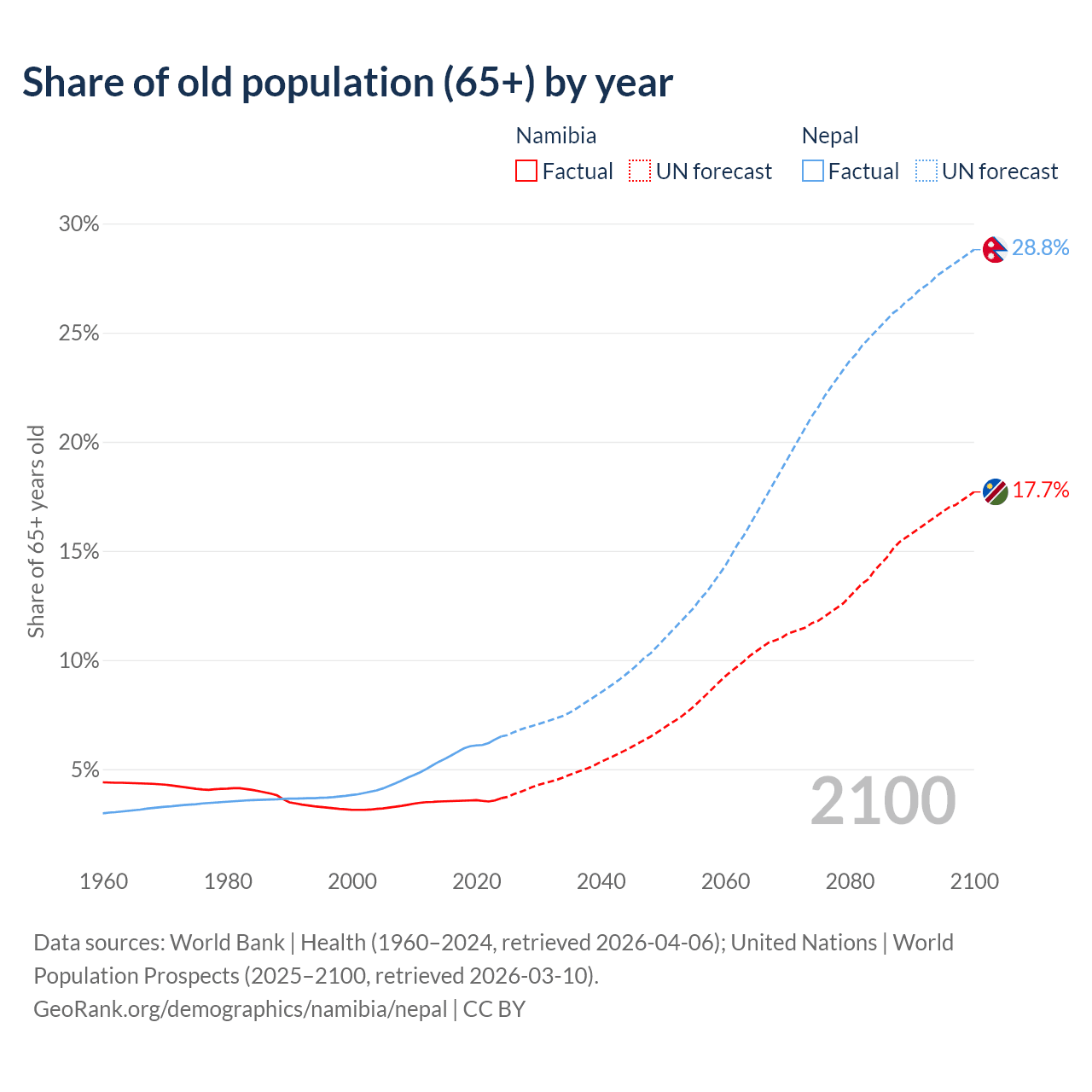 The share of older people aged 65 and over is 3.67% in Namibia and 6.5% in Nepal. Life expectancy in Namibia compared to Nepal .