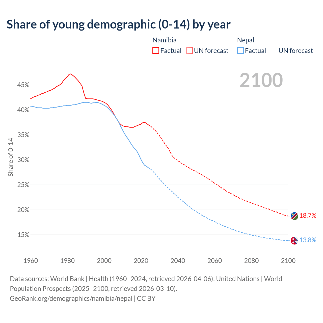 - The share of young demographic (0-15 years old) in Namibia is 37% vs 28.4% in Nepal.