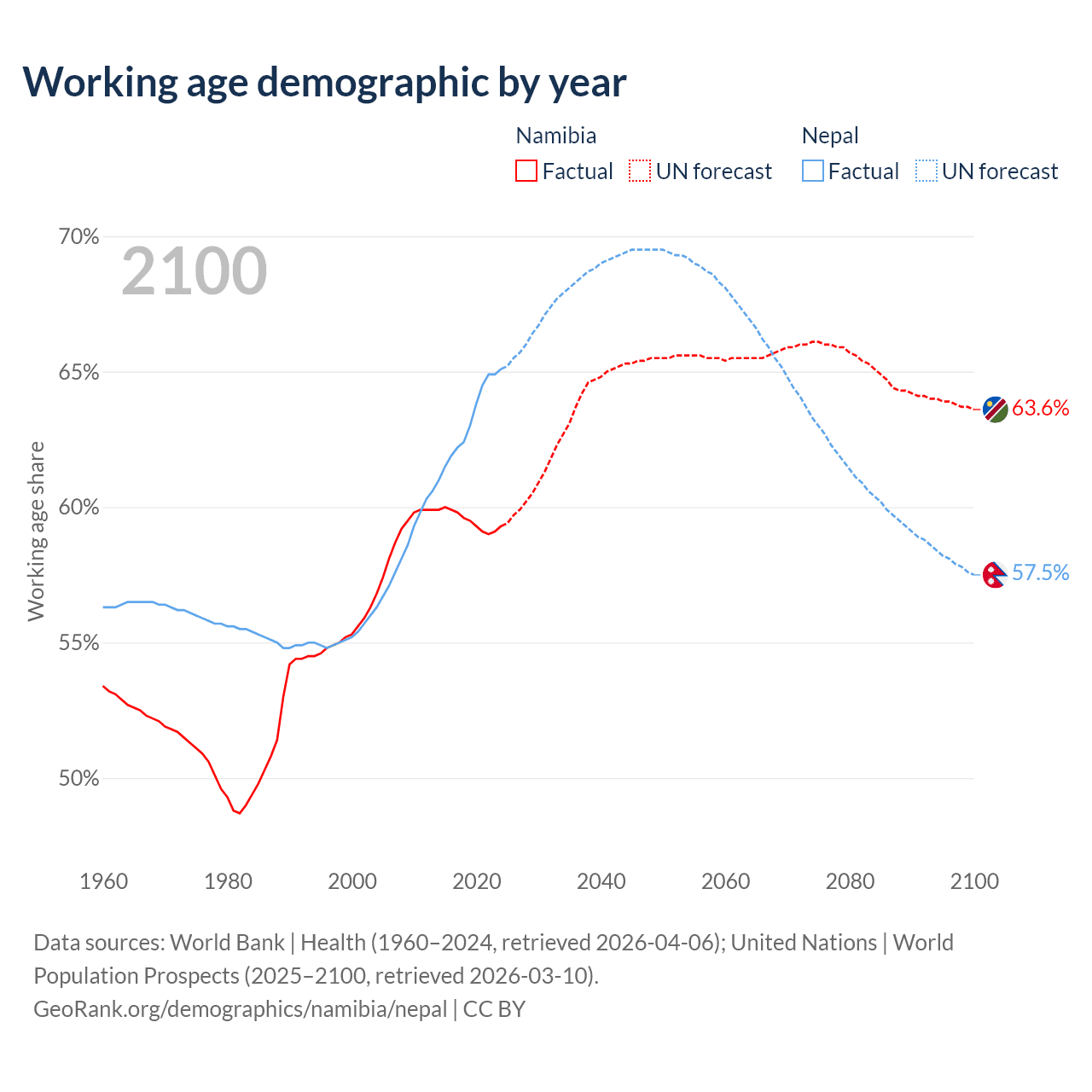Median age Namibia vs Nepal, 1960-2100