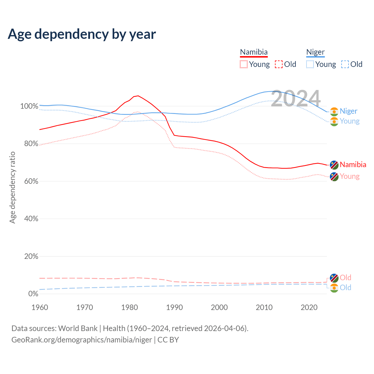 Data sources: World Bank | Health (1960–2024, retrieved 2026-04-06); U.S. Census Bureau (1960–2024, retrieved 2026-02-08).