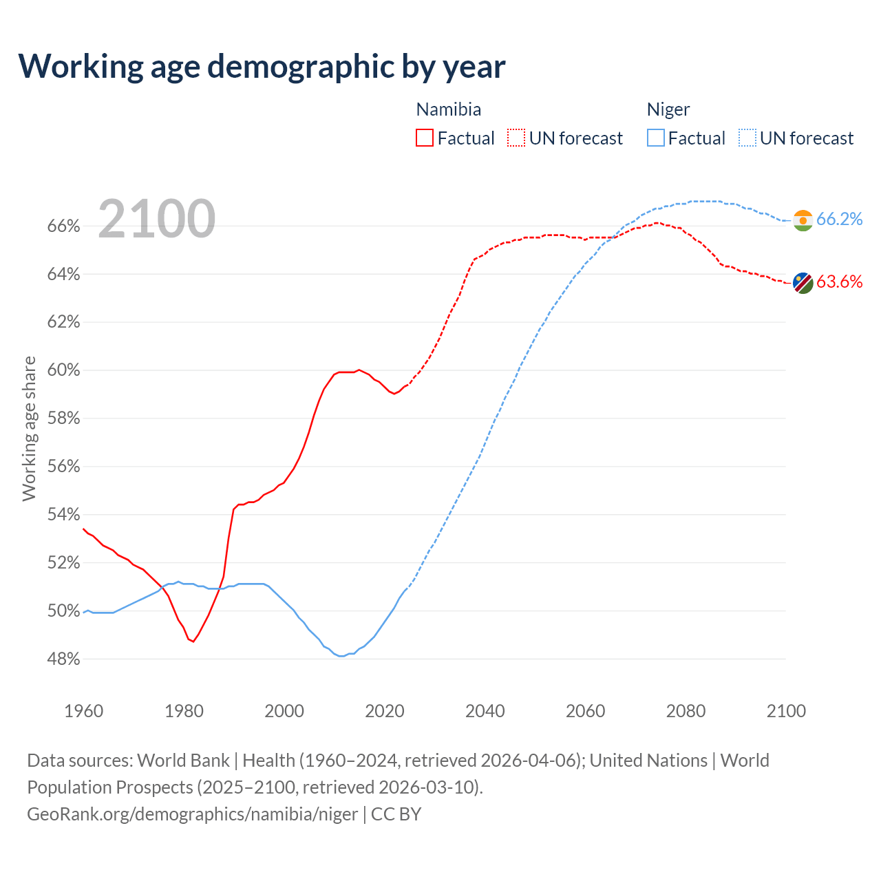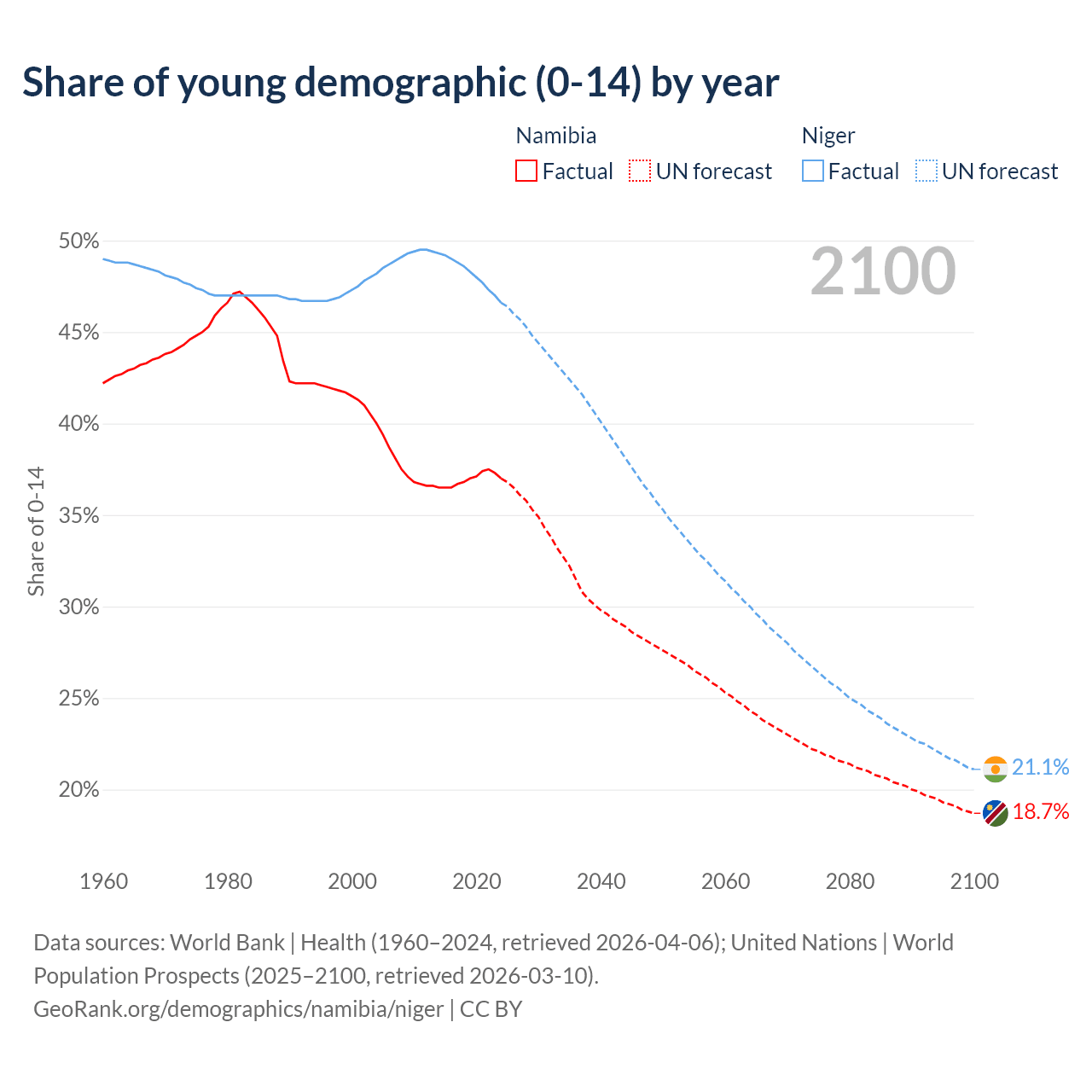 Median age Namibia vs Niger, 1960-2100