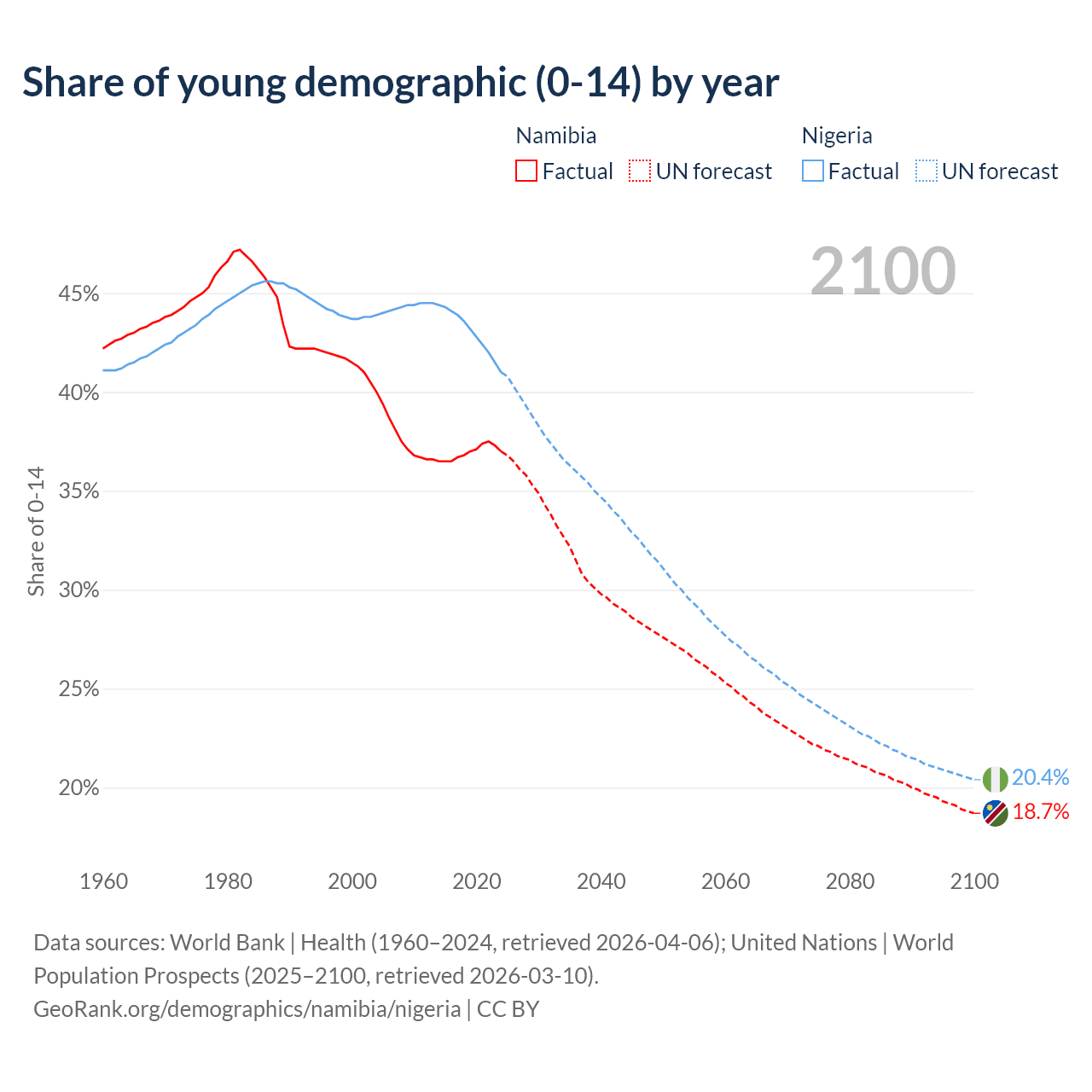 - Namibia is ranked 147/196 by median age (oldest to youngest) vs 178/196 for Nigeria.