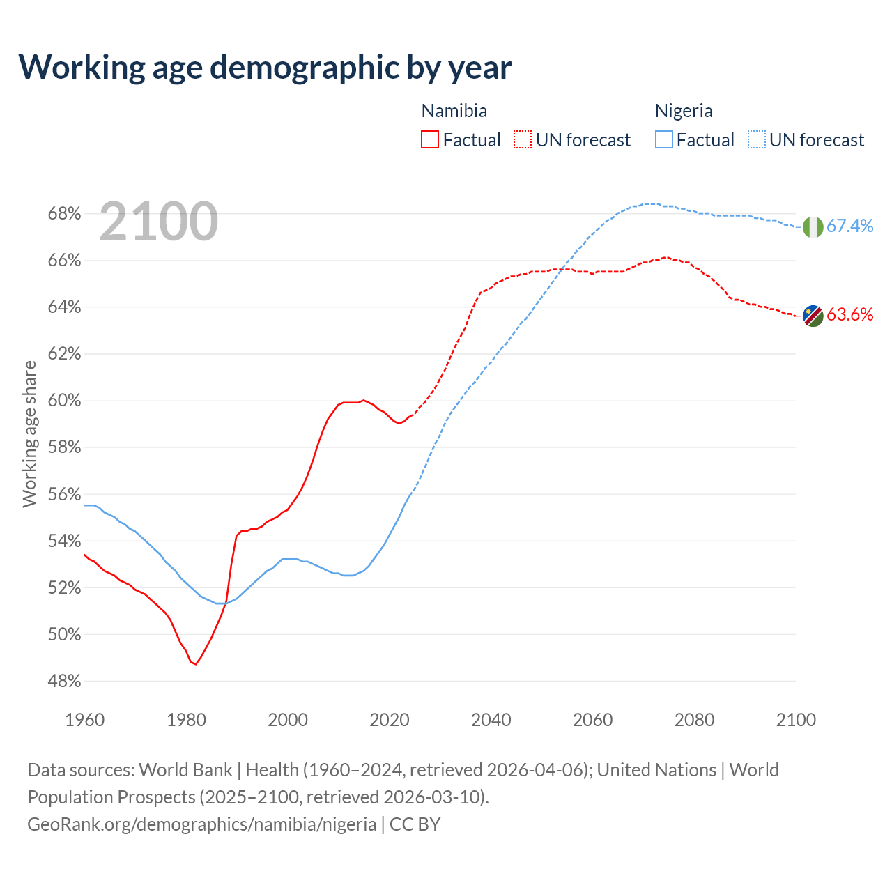 - Namibia has 1.88M working age adults (aged 15-64) vs 136M in Nigeria.
