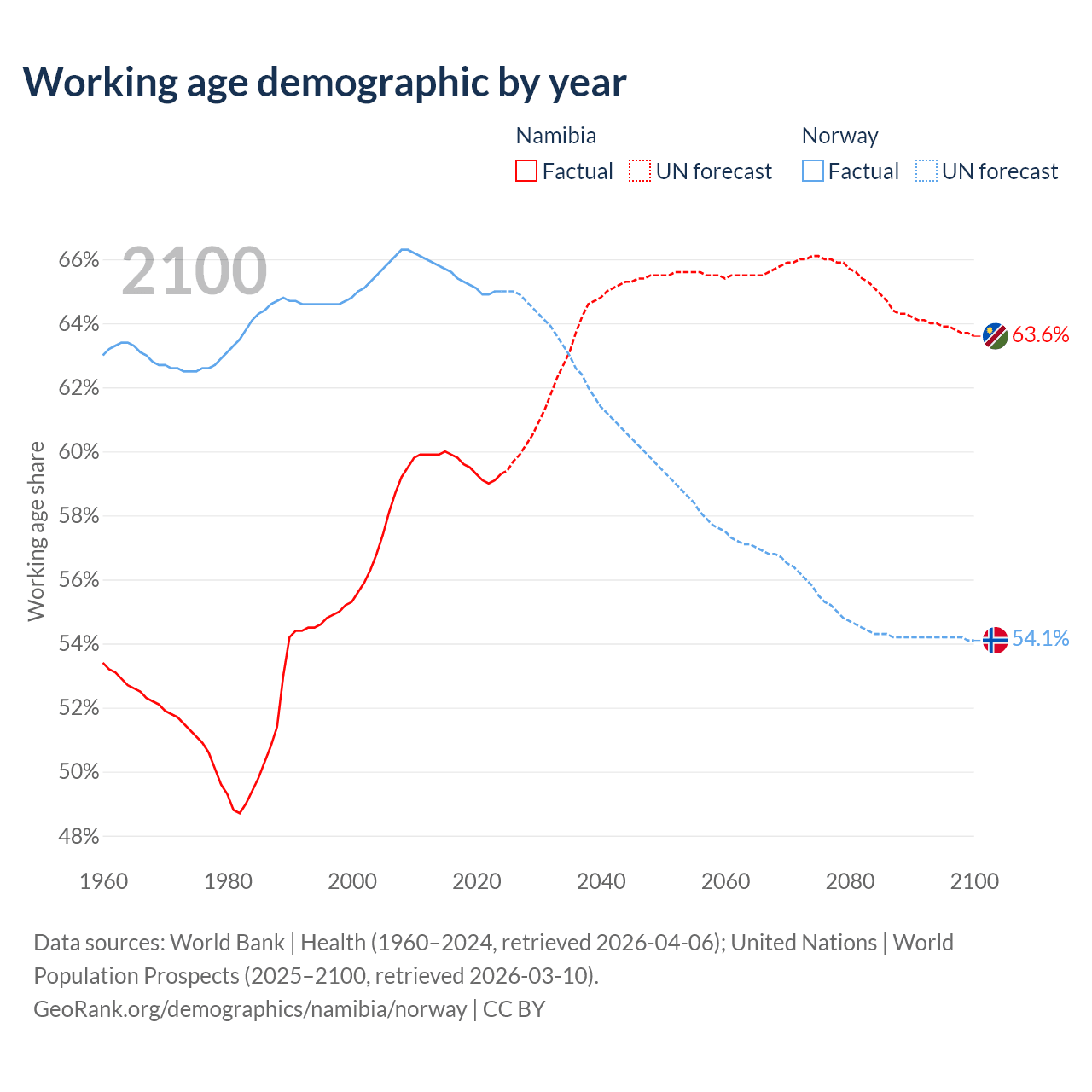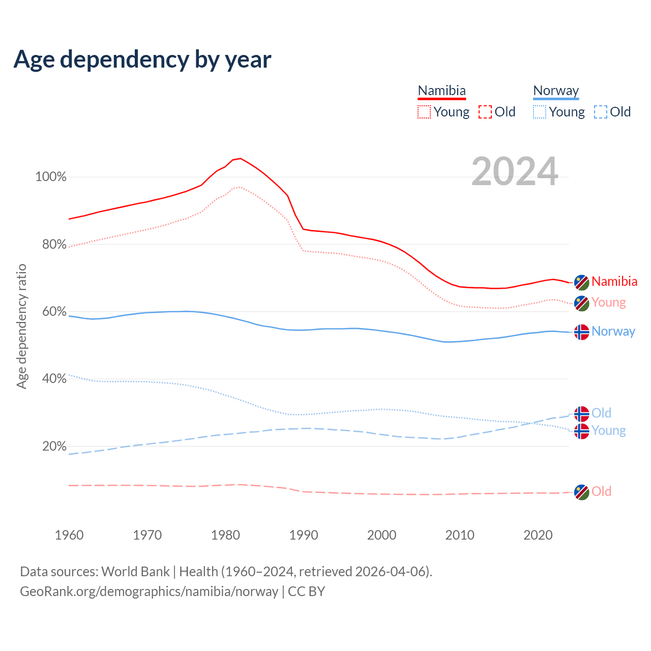 The share of older people aged 65 and over is 3.67% in Namibia and 18.8% in Norway. Life expectancy in Namibia compared to Norway .