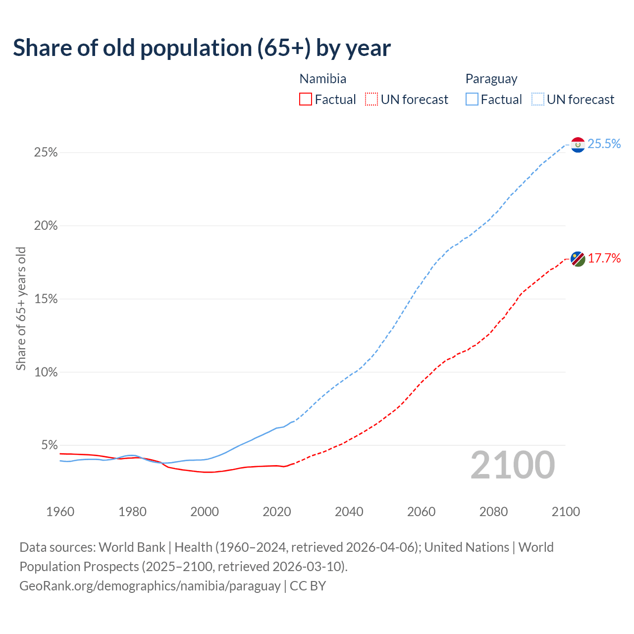 The share of older people aged 65 and over is 3.67% in Namibia and 6.54% in Paraguay. Life expectancy in Namibia compared to Paraguay .