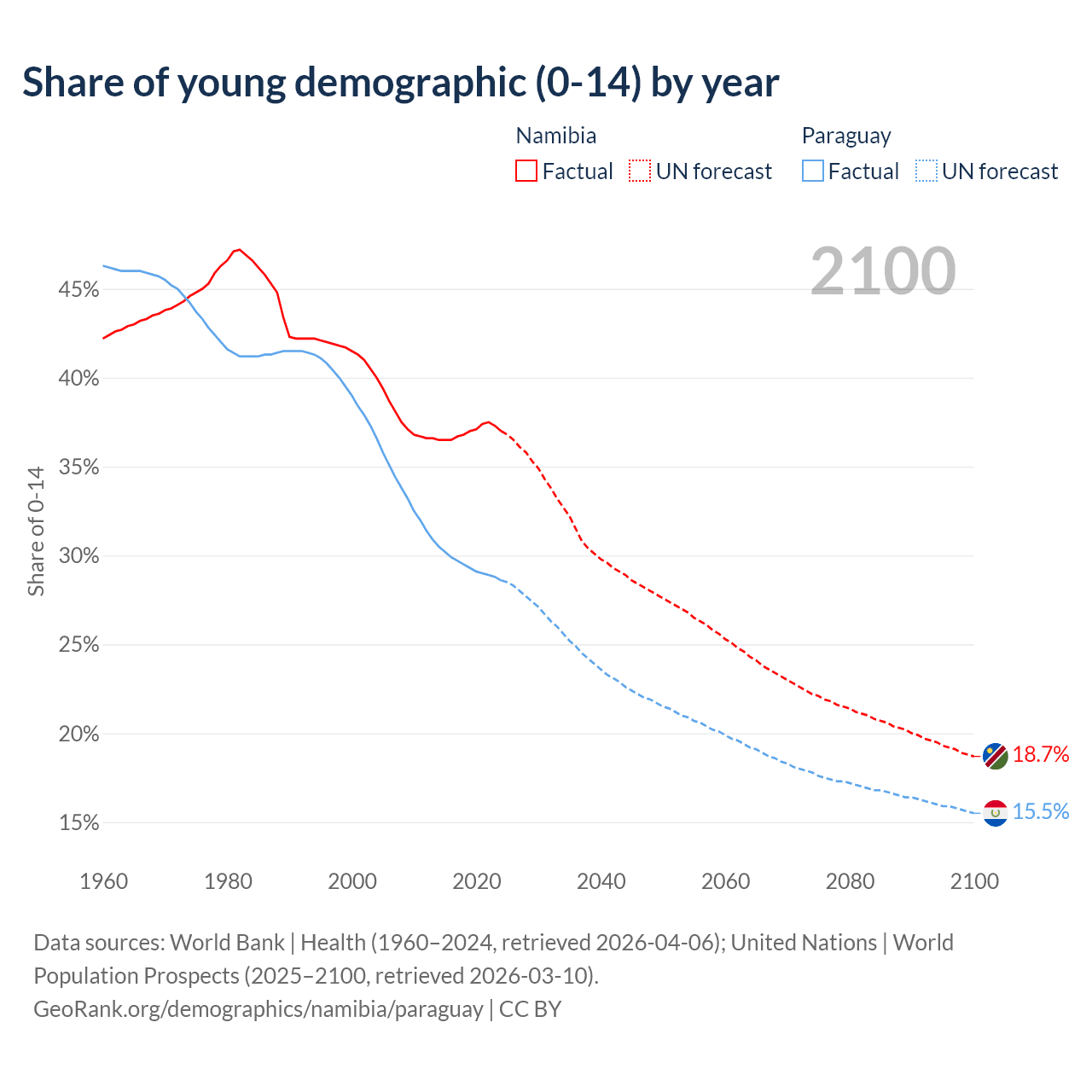 - The share of young demographic (0-15 years old) in Namibia is 37% vs 28.6% in Paraguay.