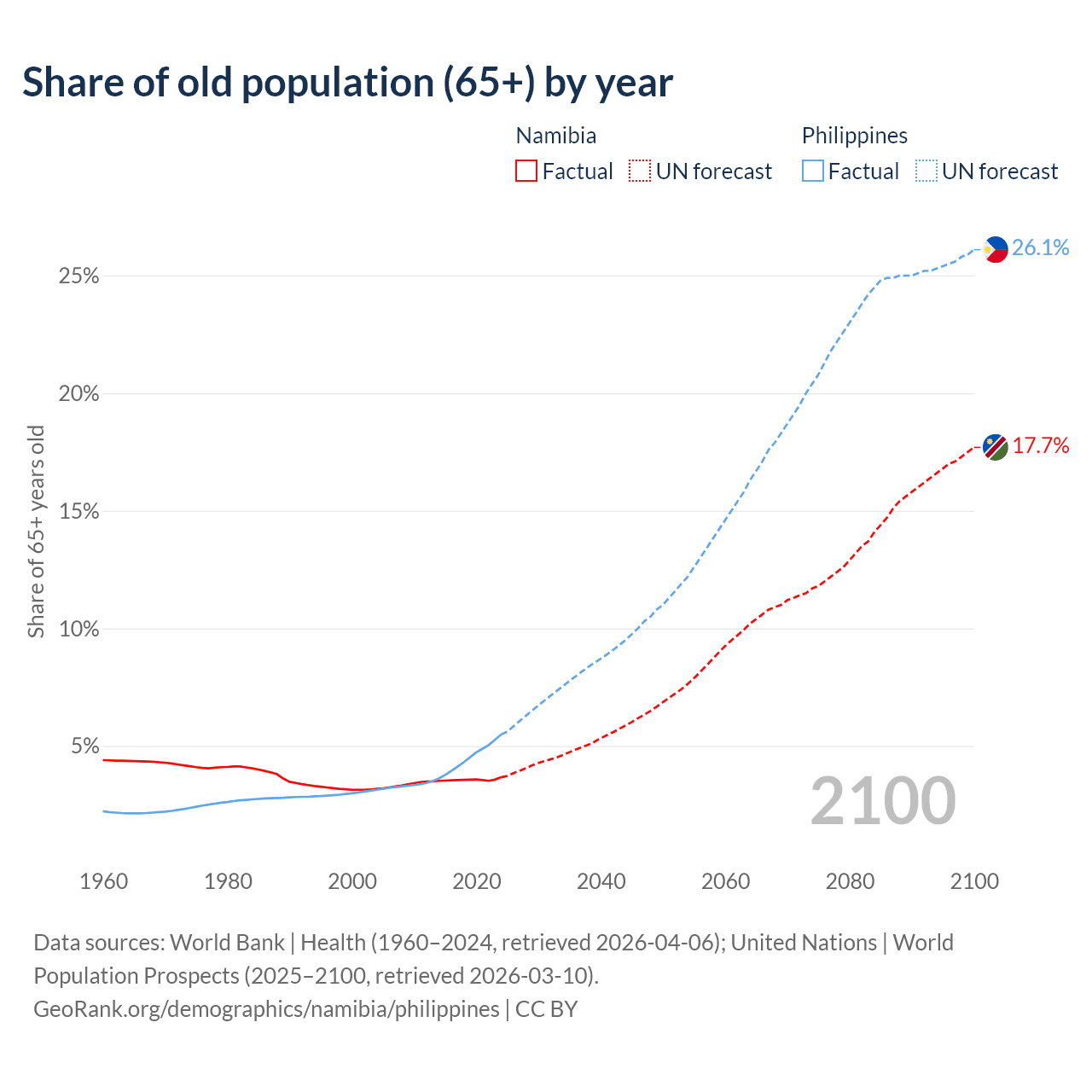 The share of older people aged 65 and over is 3.67% in Namibia and 5.49% in the Philippines. Life expectancy in Namibia compared to the Philippines .