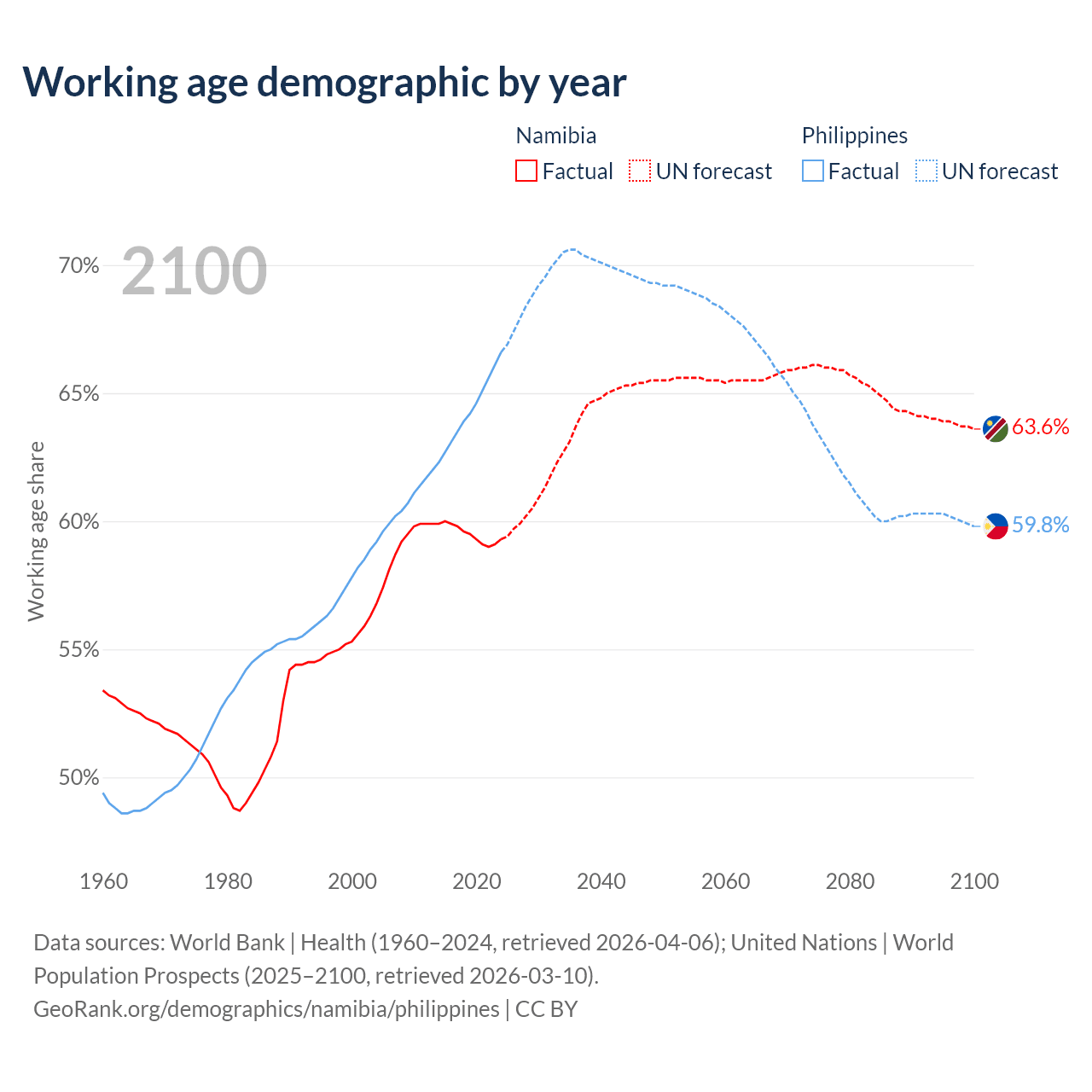 - Namibia has 1.88M working age adults (aged 15-64) vs 78.6M in the Philippines.
