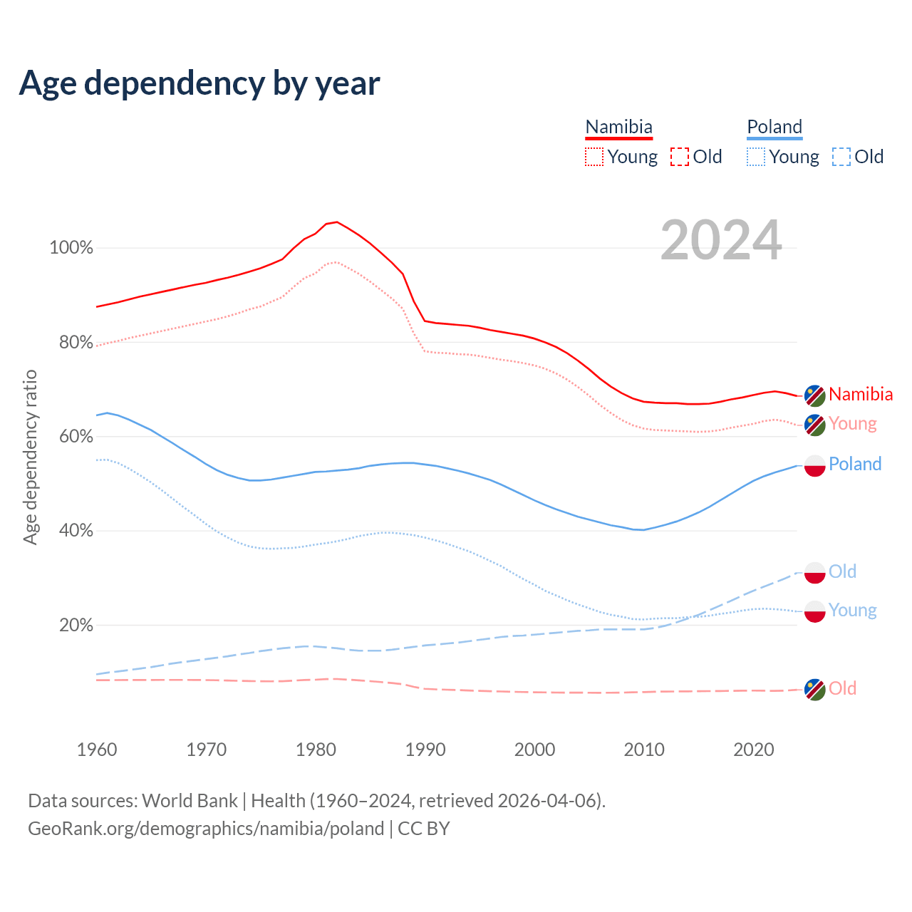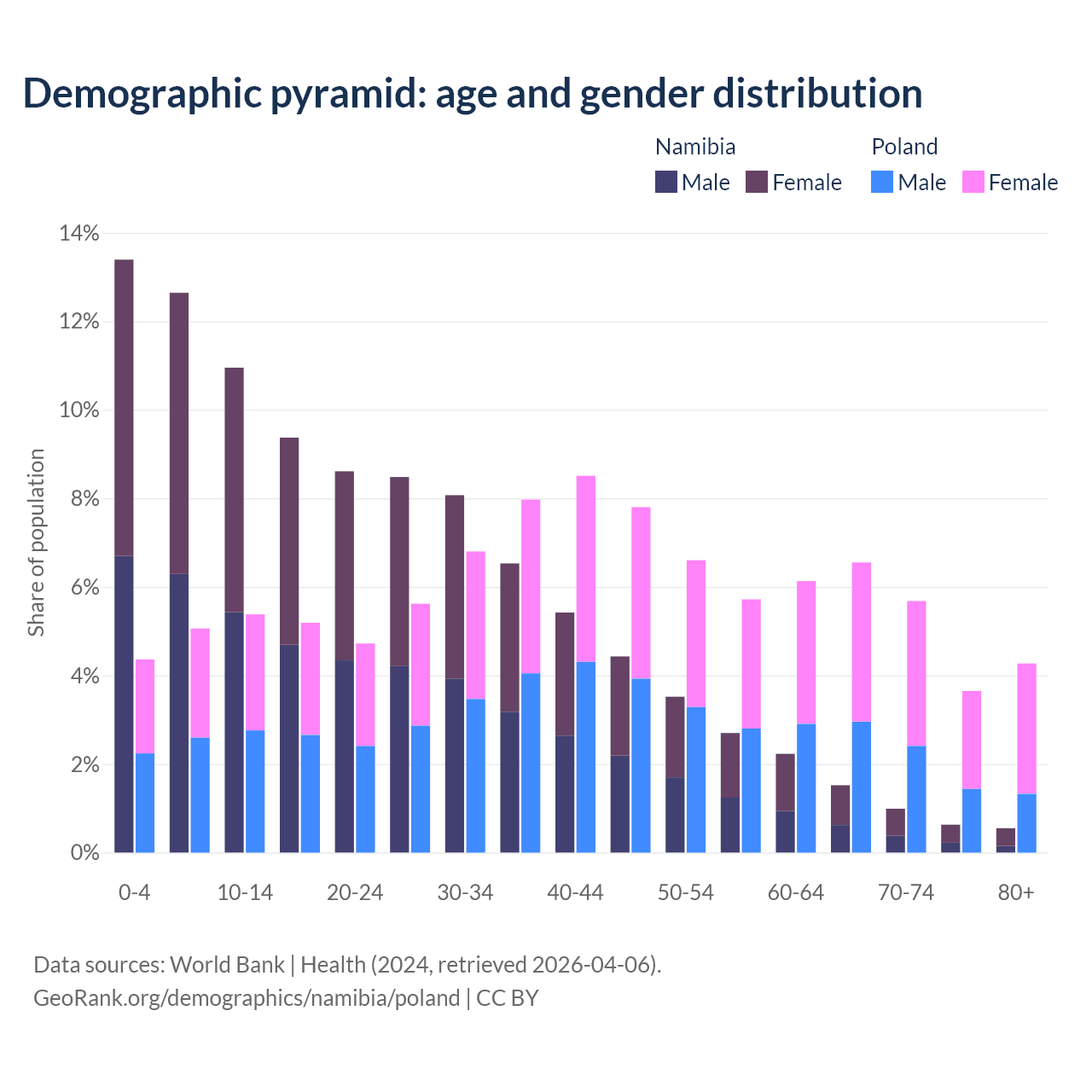 The share of older people aged 65 and over is 3.67% in Namibia and 20.1% in Poland. Life expectancy in Namibia compared to Poland .