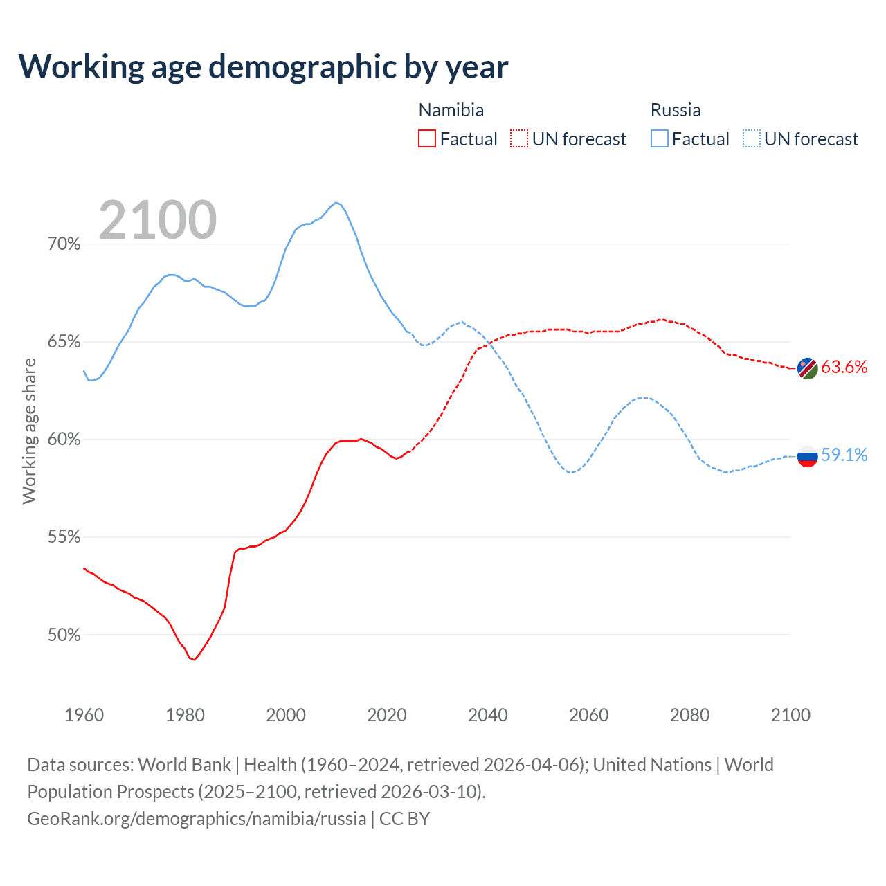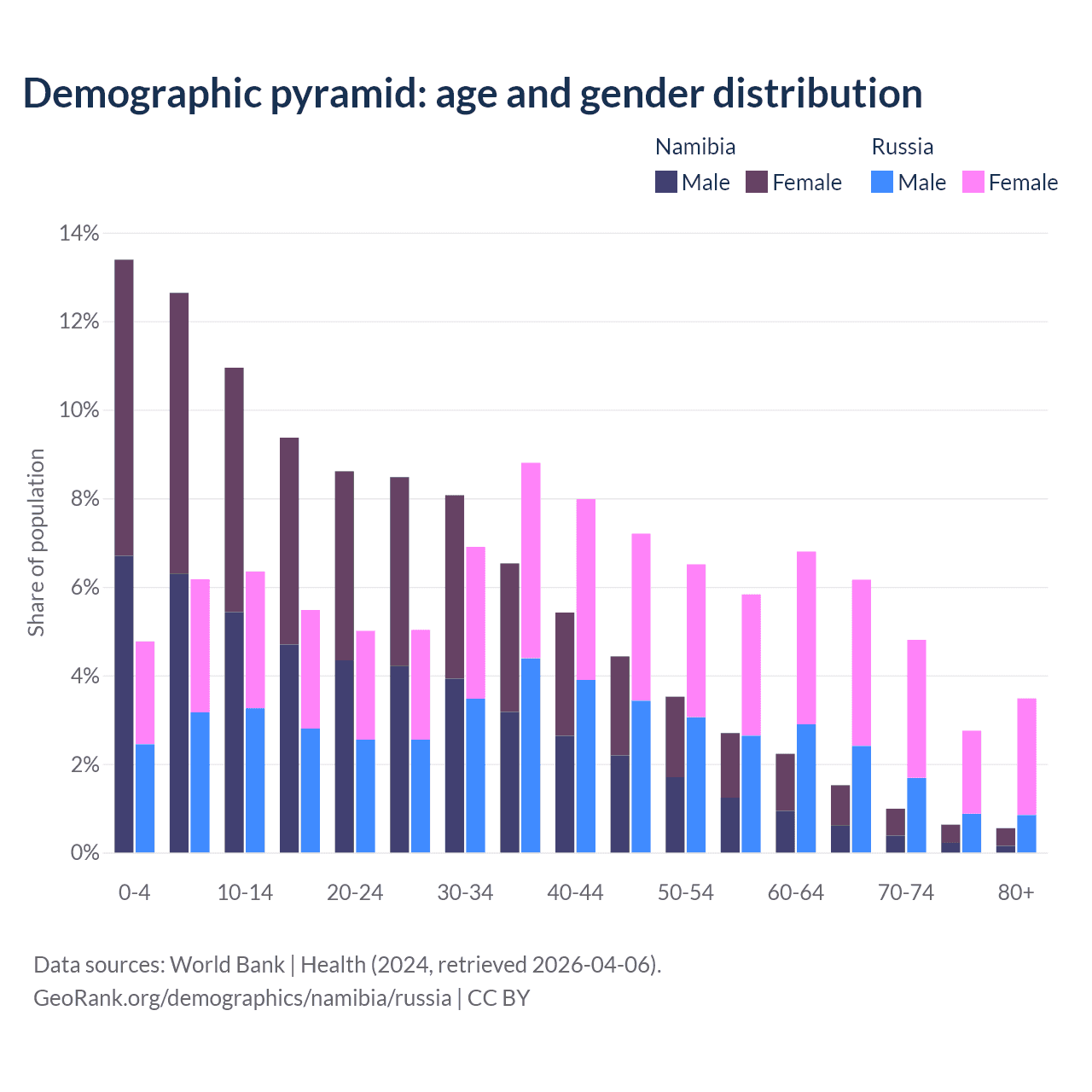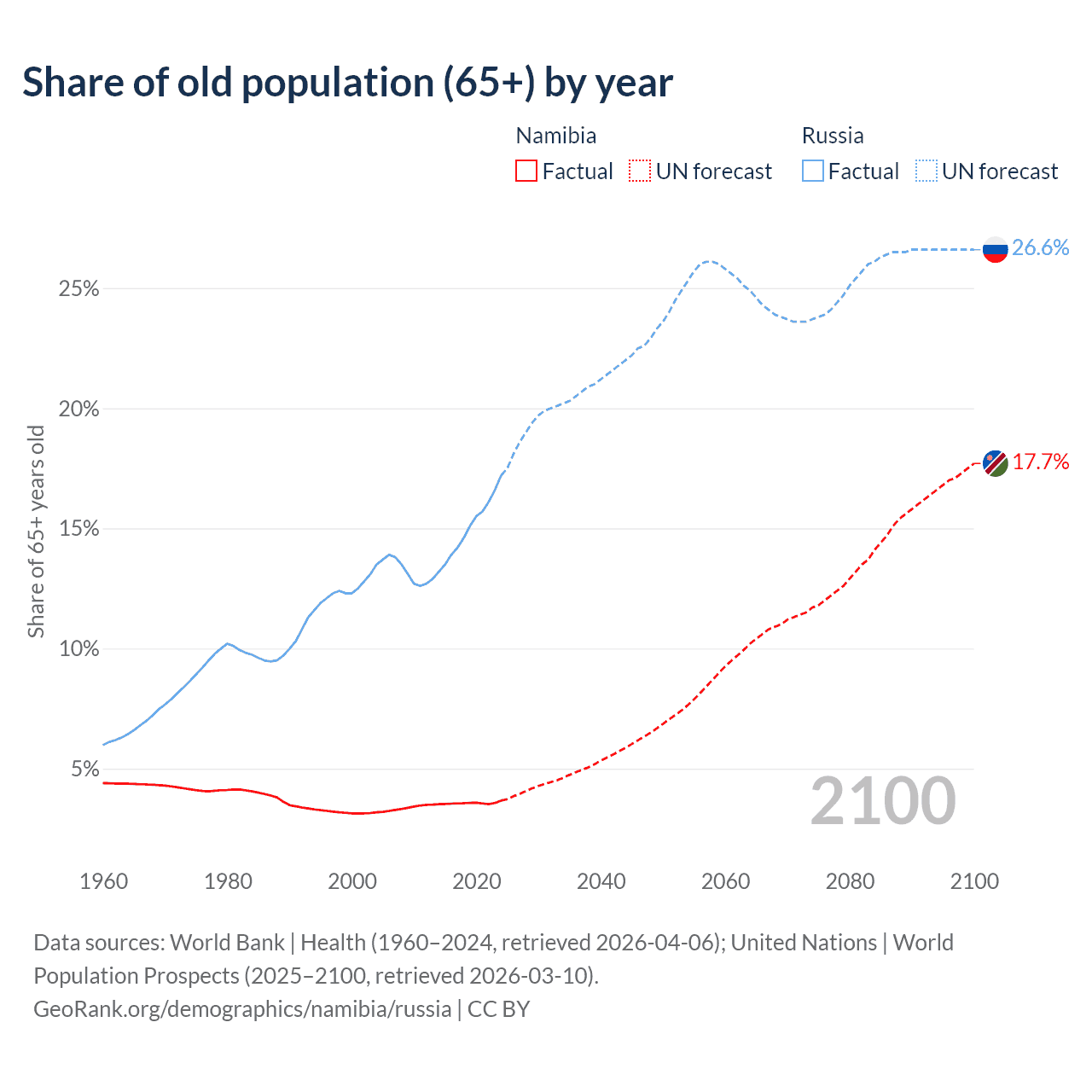 The share of older people aged 65 and over is 3.67% in Namibia and 17.2% in Russia. Life expectancy in Namibia compared to Russia .