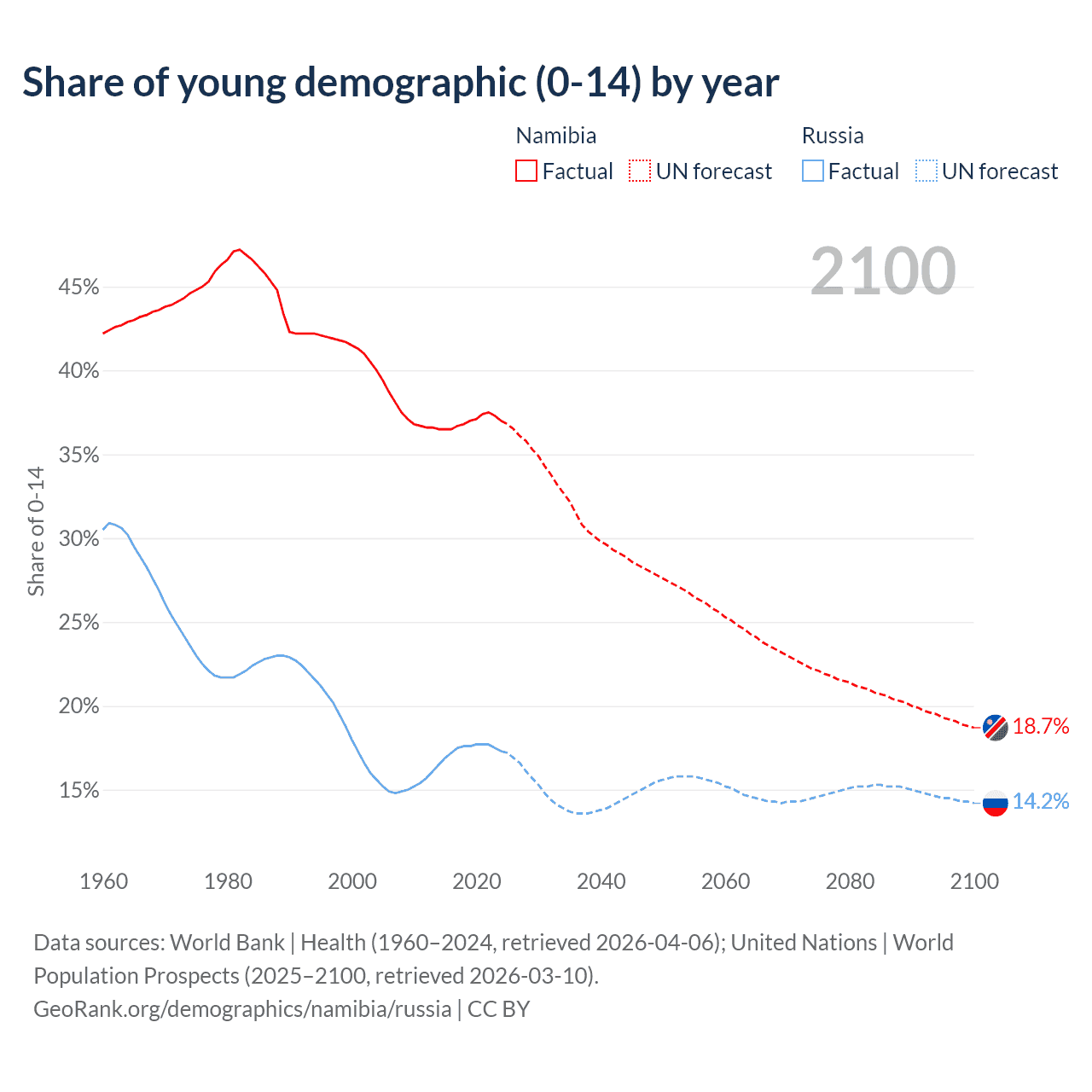 Median age Namibia vs Russia, 1960-2100