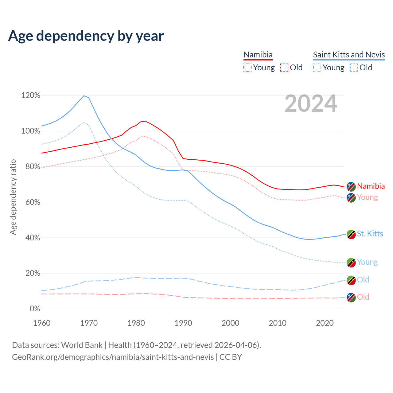 - The share of old-age demographic (65+) in Namibia is 3.67% vs 11.2% in Saint Kitts and Nevis.
