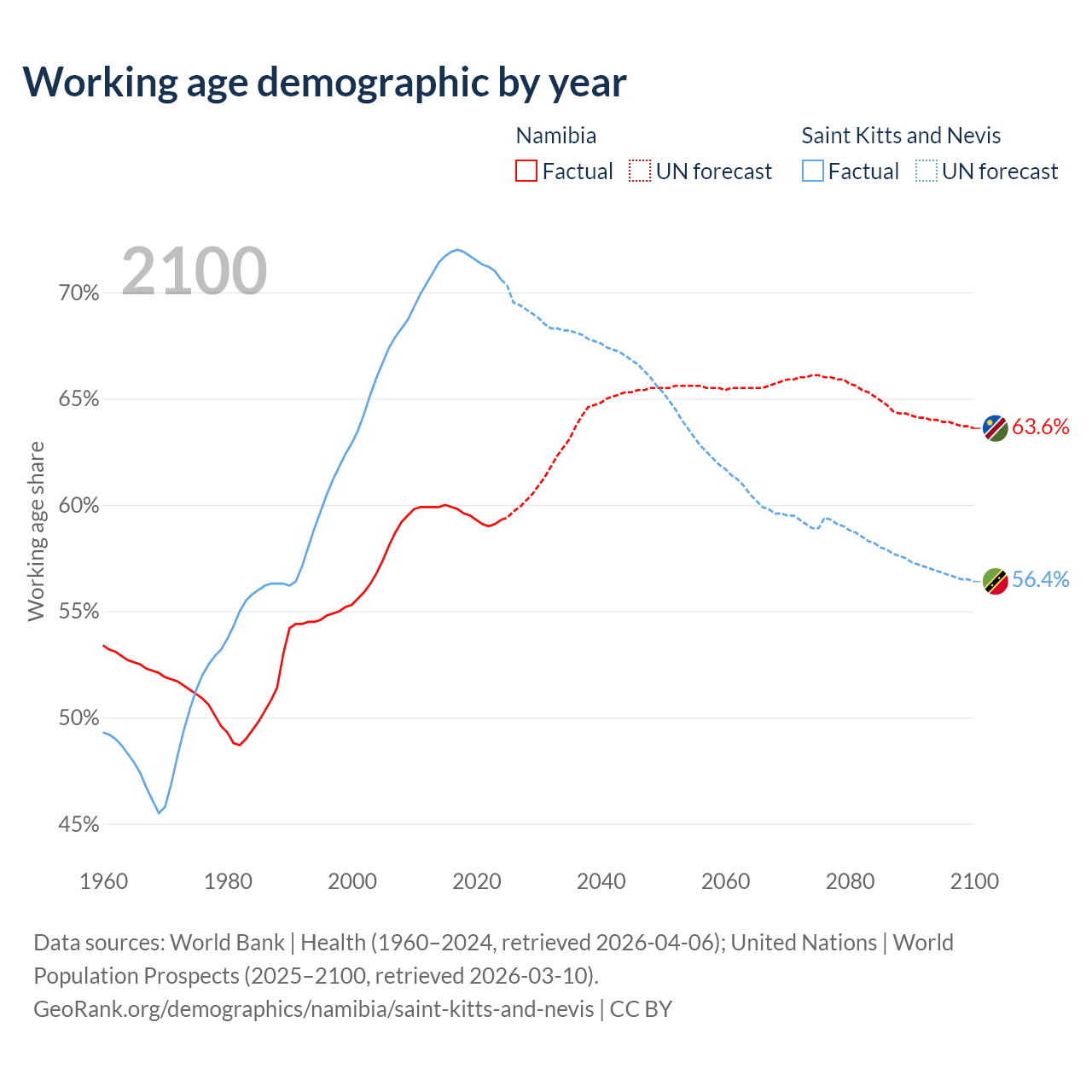 - Namibia has 1.88M working age adults (aged 15-64) vs 33.2K in Saint Kitts and Nevis.