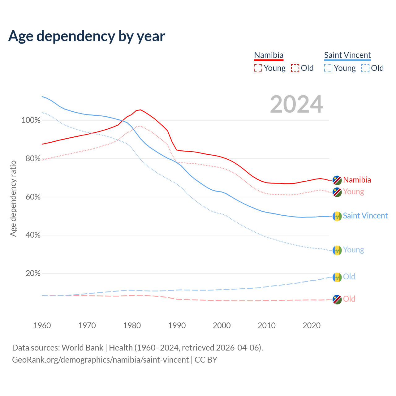 - The share of old-age demographic (65+) in Namibia is 3.67% vs 11.9% in Saint Vincent.