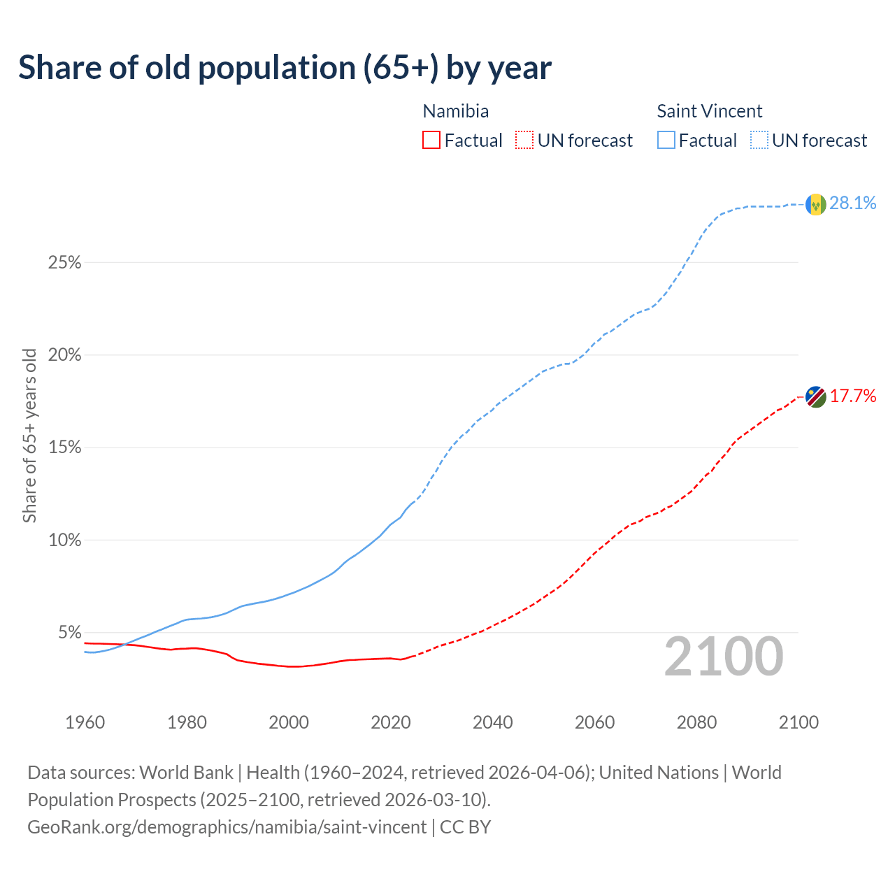 The share of older people aged 65 and over is 3.67% in Namibia and 11.9% in Saint Vincent. Life expectancy in Namibia compared to Saint Vincent .