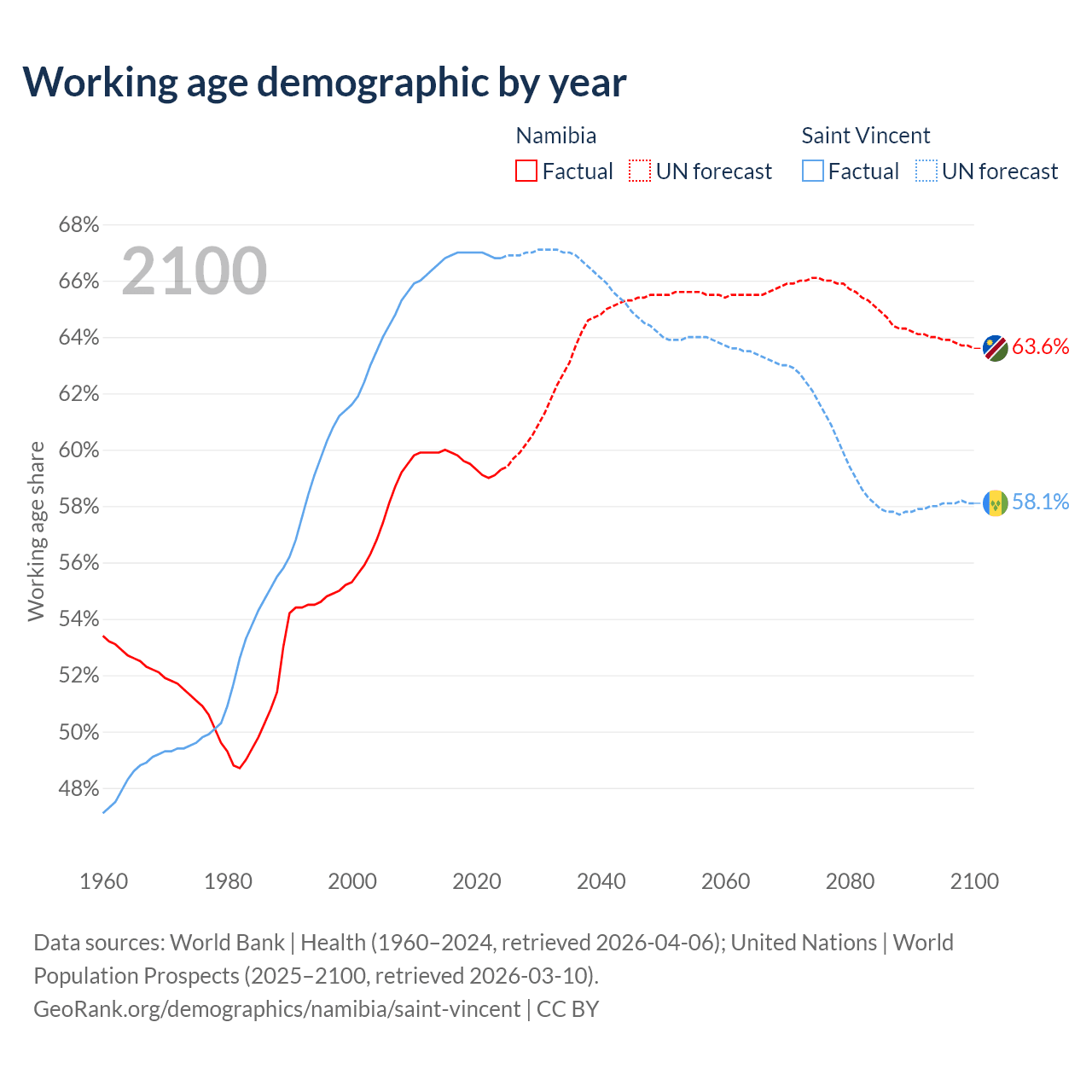- Namibia has 1.88M working age adults (aged 15-64) vs 66.3K in Saint Vincent.
