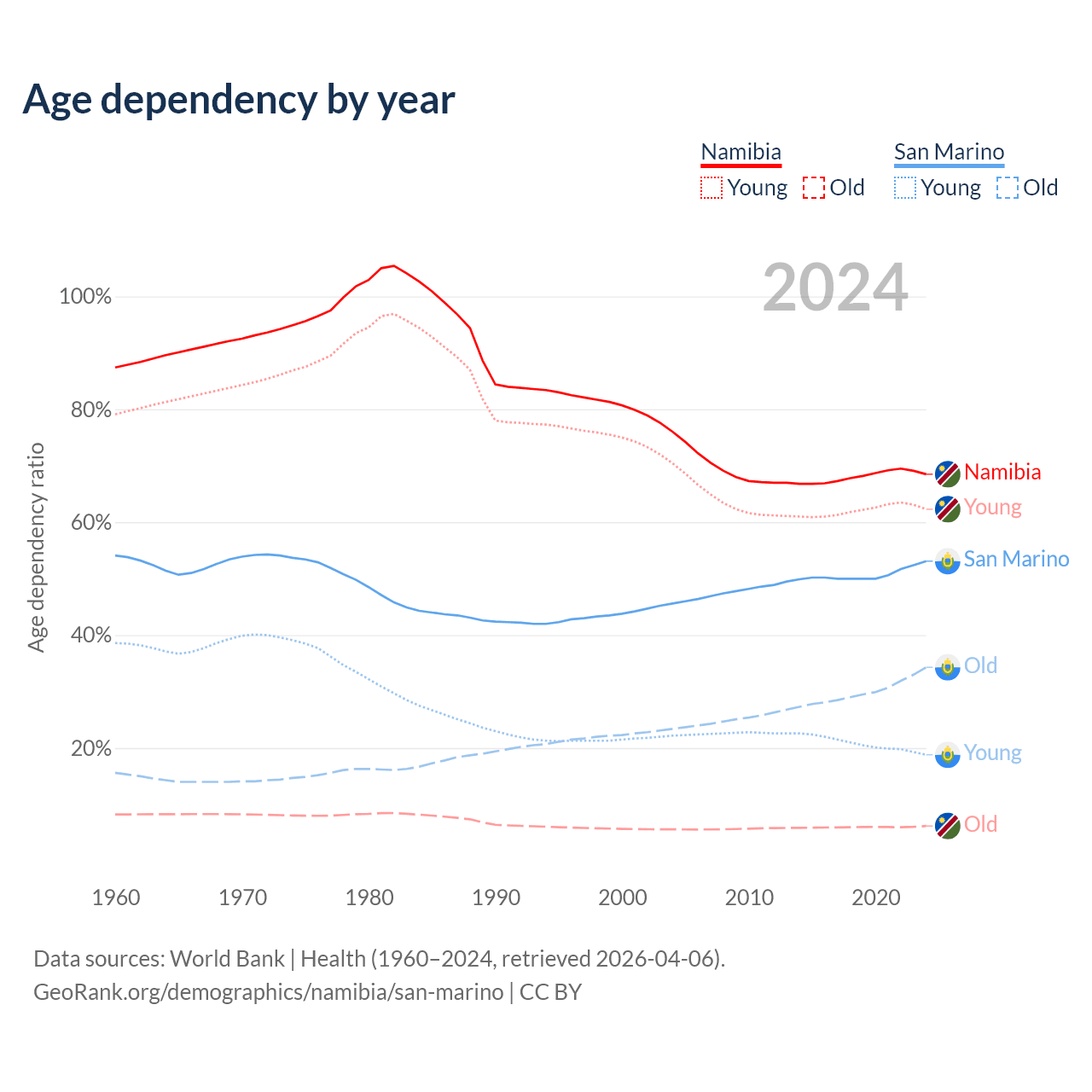 - The share of old-age demographic (65+) in Namibia is 3.67% vs 22.4% in San Marino.