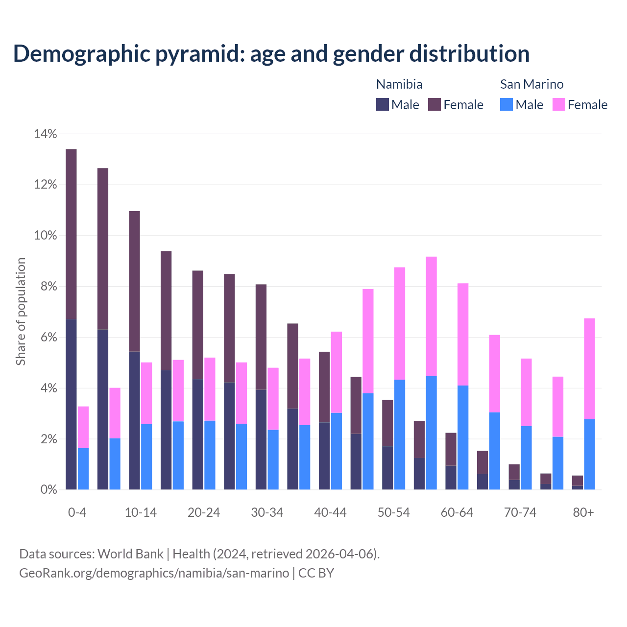 - Namibia is ranked 147/196 by median age (oldest to youngest) vs 3/196 for San Marino.