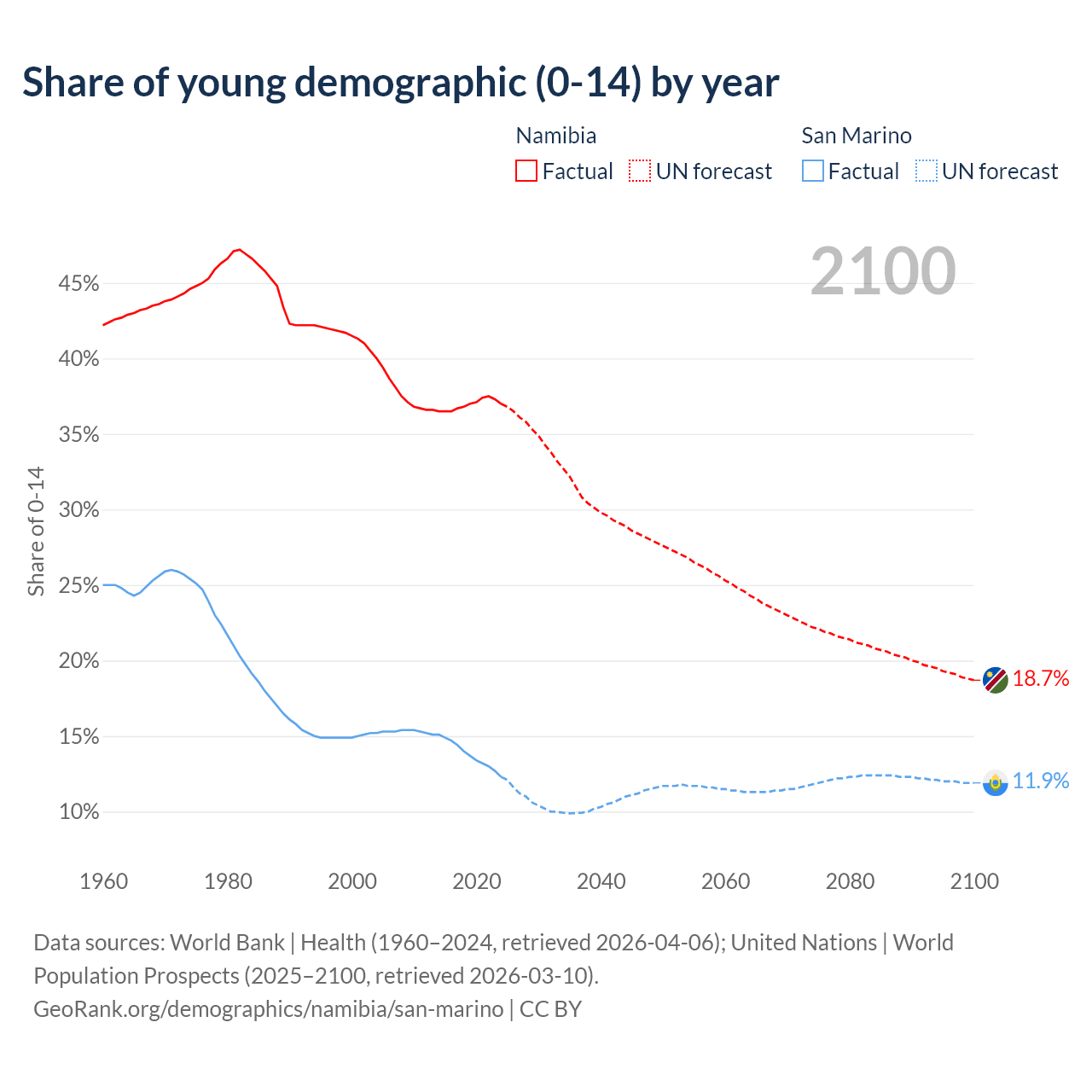 - The share of young demographic (0-15 years old) in Namibia is 37% vs 12.3% in San Marino.