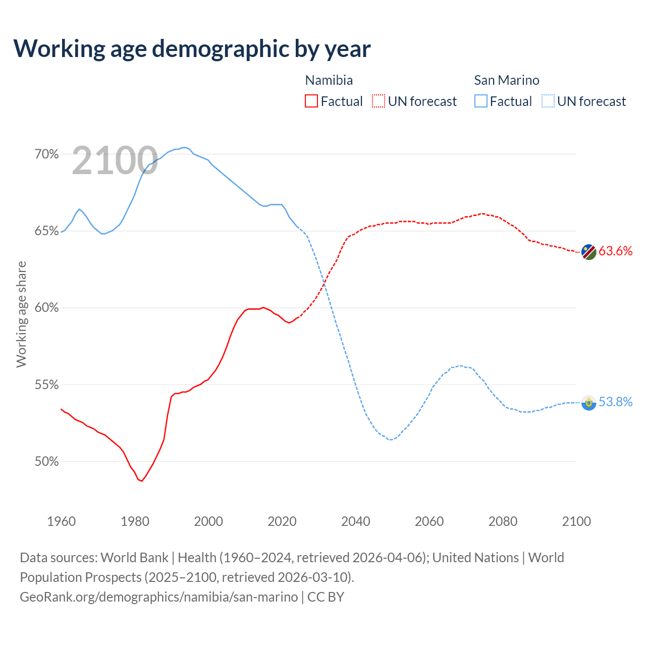 - Namibia has 1.88M working age adults (aged 15-64) vs 22.2K in San Marino.