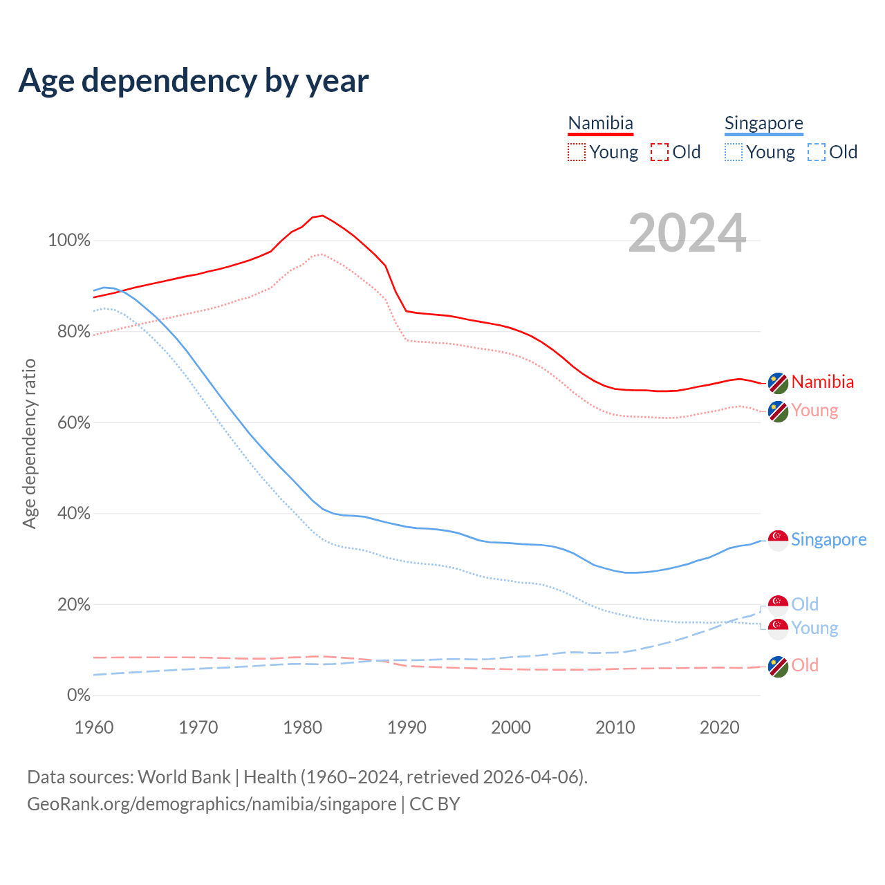 - Namibia is ranked 147/196 by median age (oldest to youngest) vs 68/196 for Singapore.