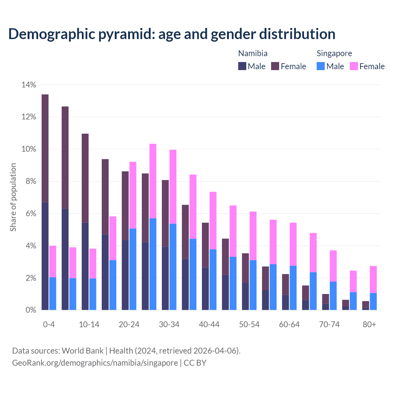 The share of older people aged 65 and over is 3.67% in Namibia and 13.7% in Singapore. Life expectancy in Namibia compared to Singapore .