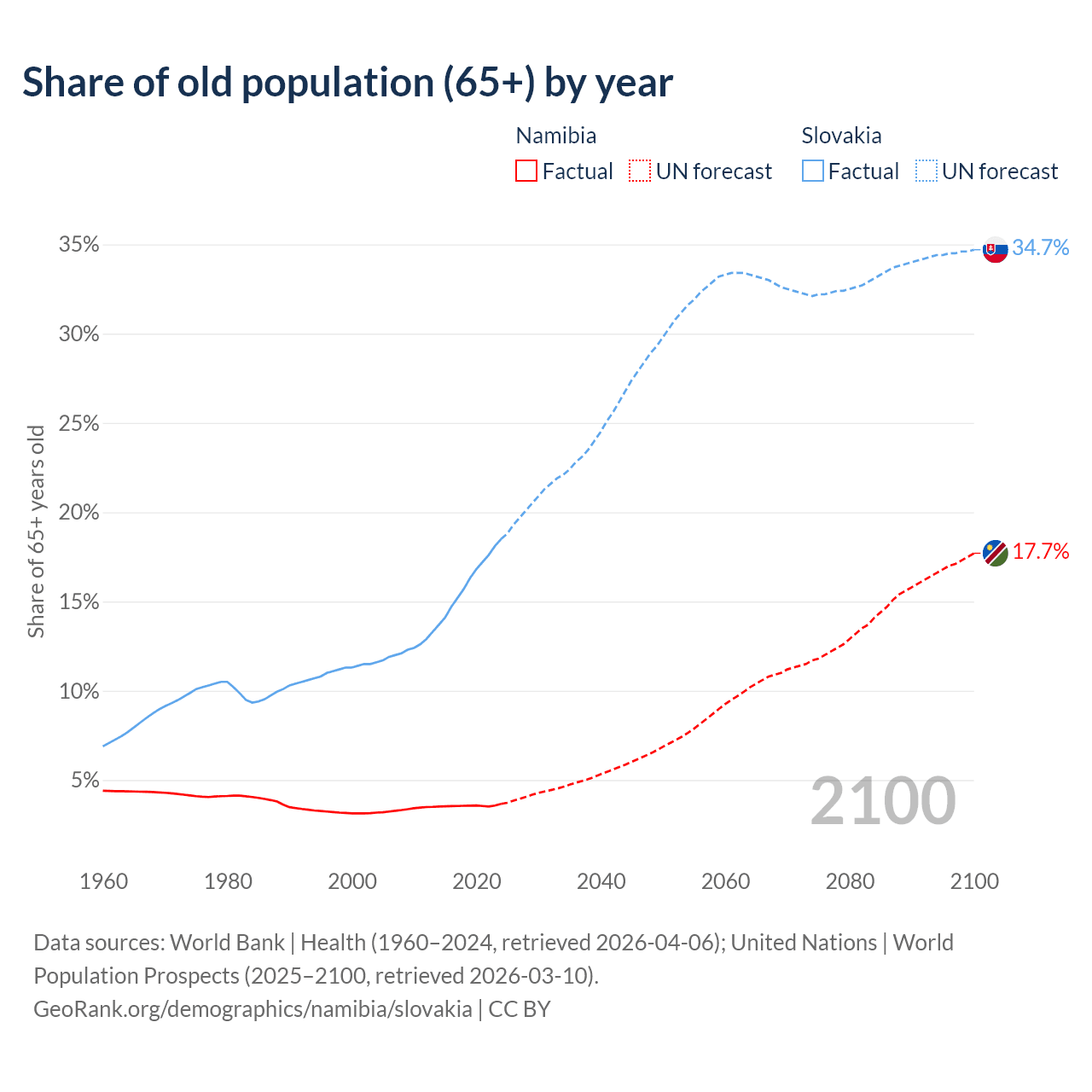 The share of older people aged 65 and over is 3.67% in Namibia and 18.5% in Slovakia. Life expectancy in Namibia compared to Slovakia .