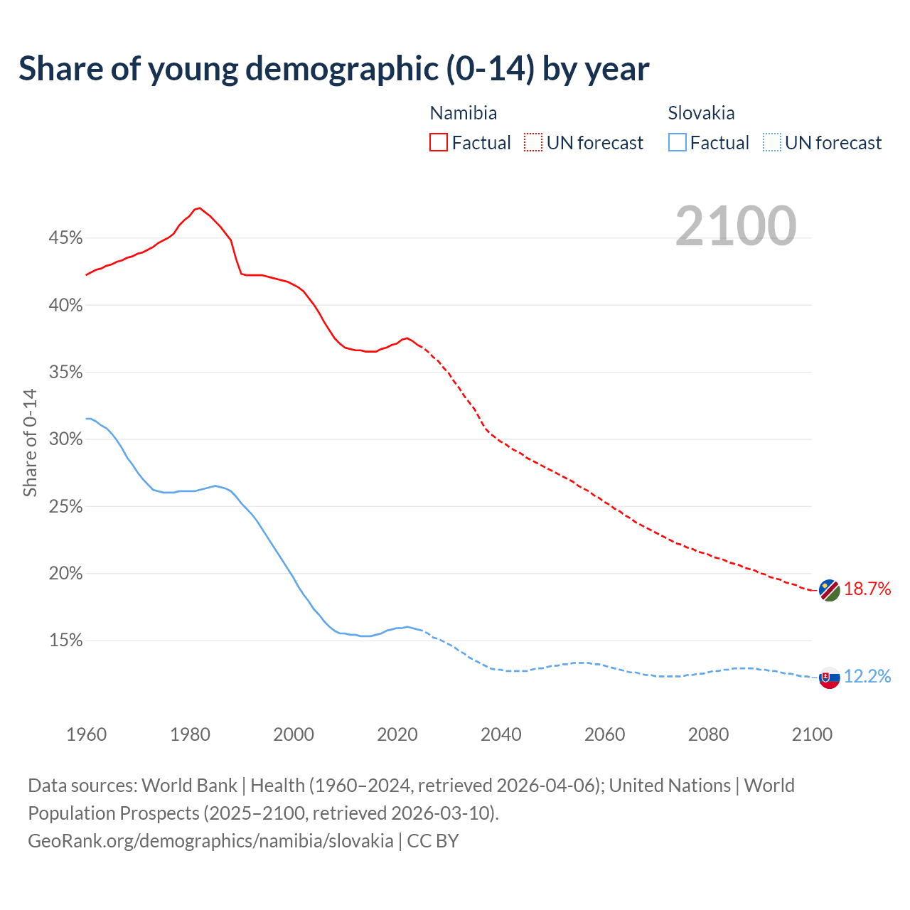 - The share of young demographic (0-15 years old) in Namibia is 37% vs 15.8% in Slovakia.