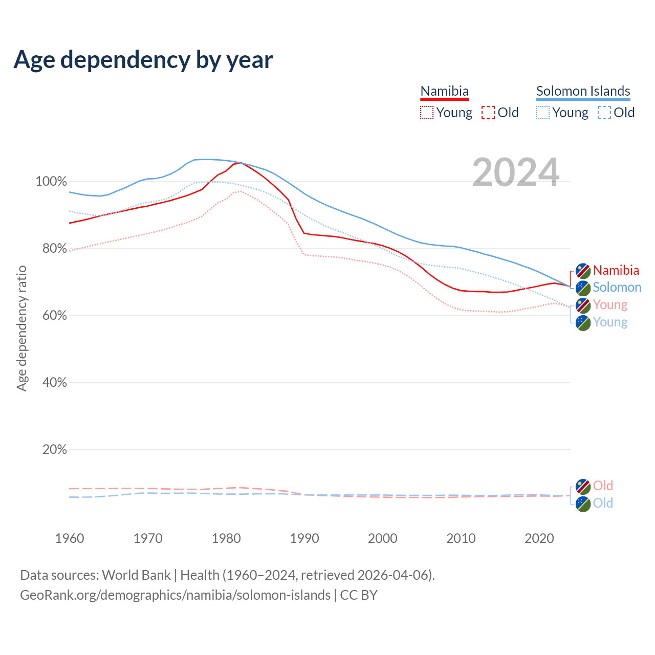 The share of older people aged 65 and over is 3.67% in Namibia and 3.64% in the Solomon Islands. Life expectancy in Namibia compared to the Solomon Islands .