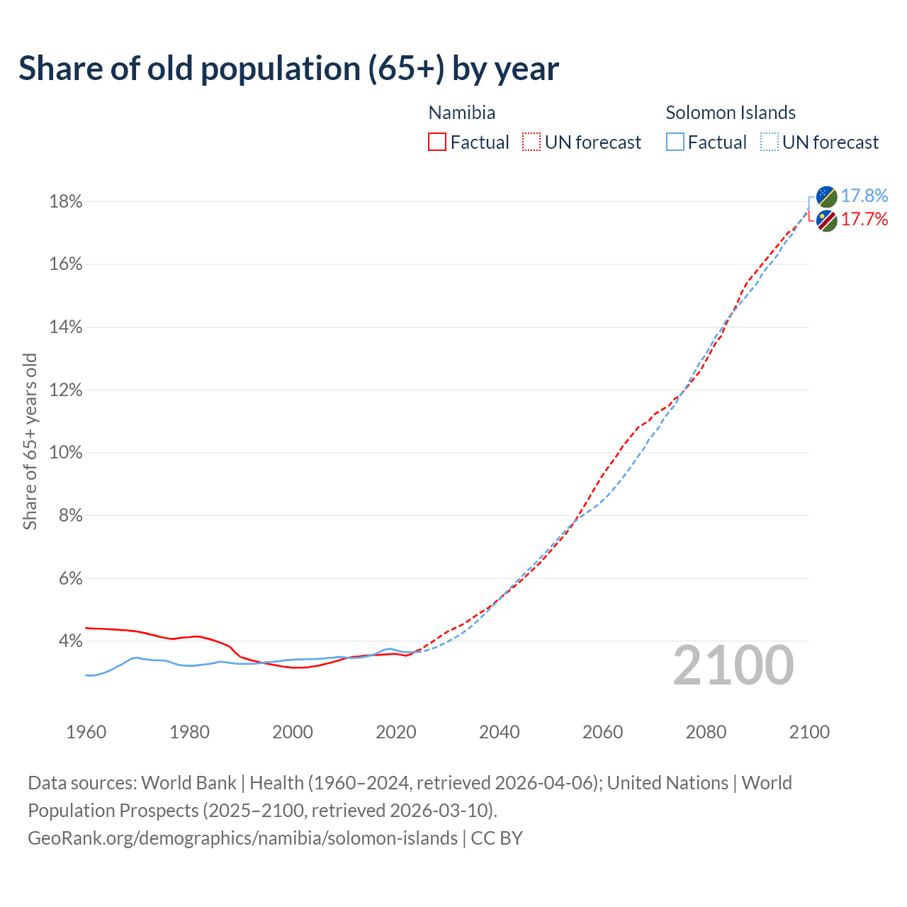 - The share of old-age demographic (65+) in Namibia is 3.67% vs 3.64% in the Solomon Islands.