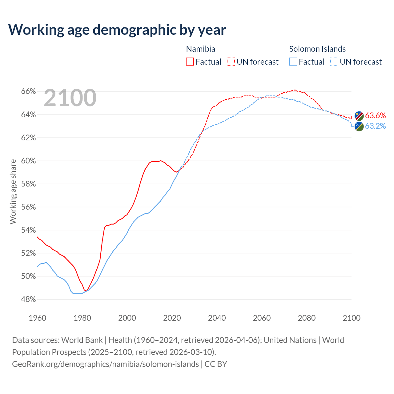- Namibia has 1.88M working age adults (aged 15-64) vs 513K in the Solomon Islands.