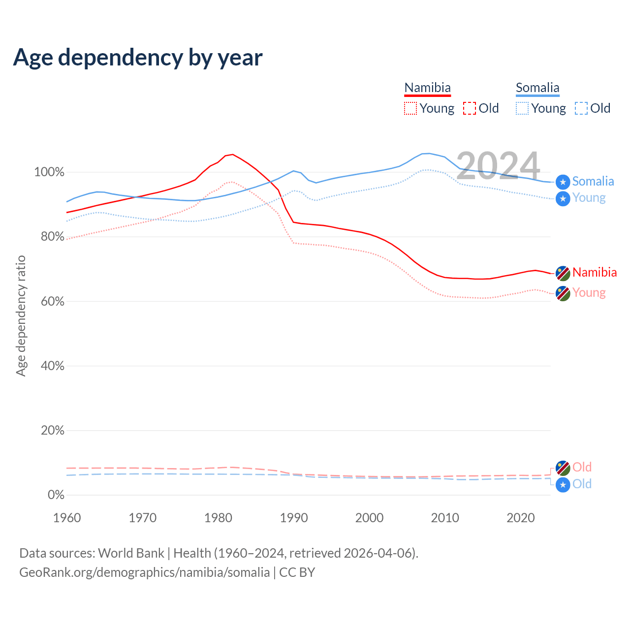 Data sources: World Bank | Health (1960–2024, retrieved 2026-04-06); U.S. Census Bureau (1960–2024, retrieved 2026-02-08).