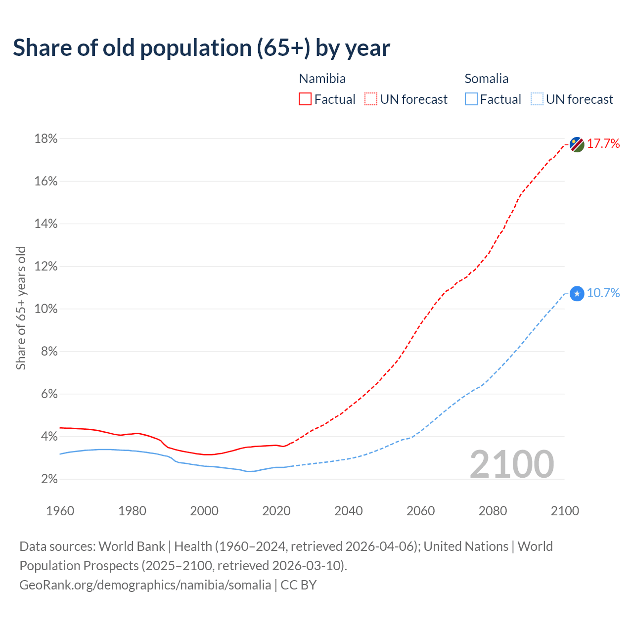 The share of older people aged 65 and over is 3.67% in Namibia and 2.59% in Somalia. Life expectancy in Namibia compared to Somalia .