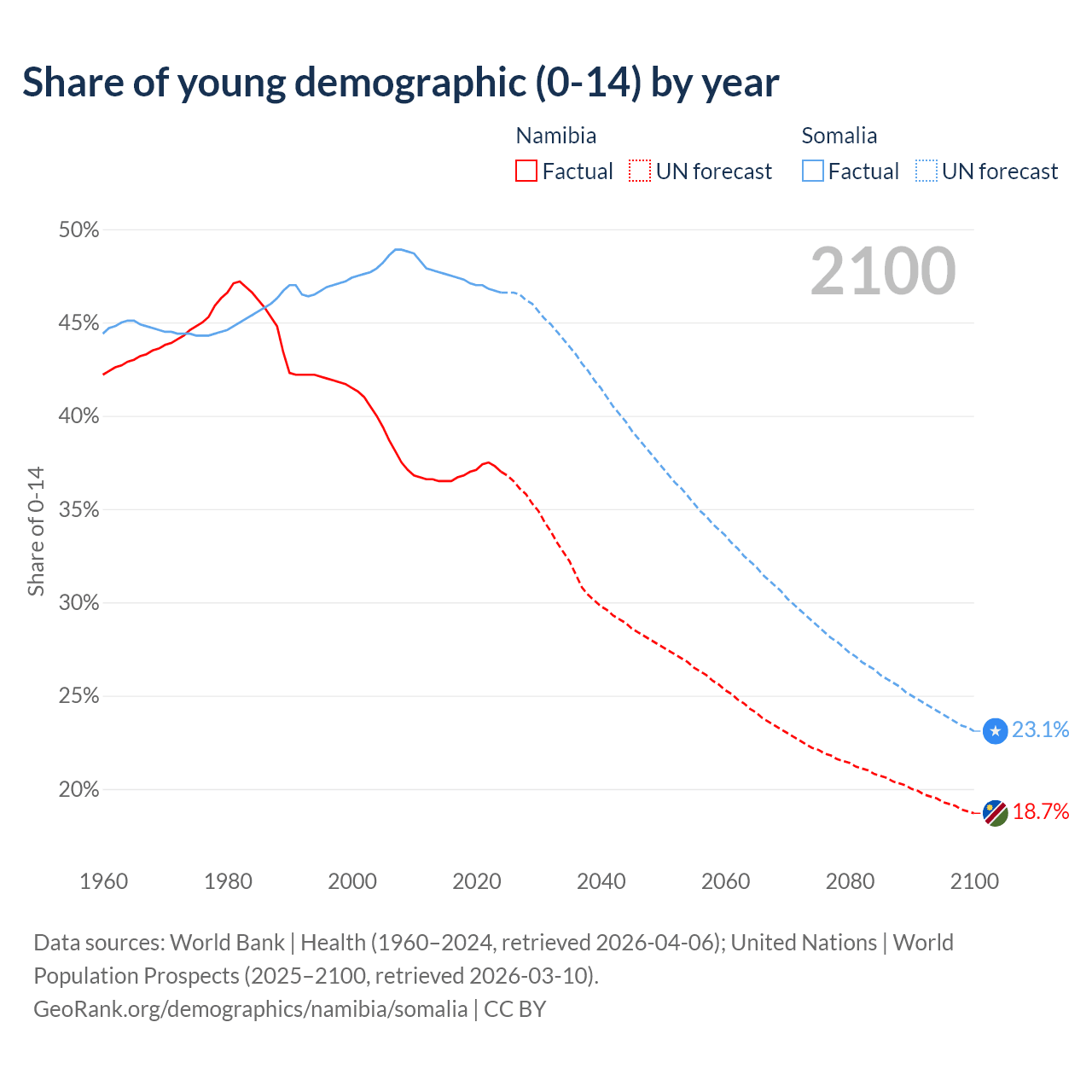 - The share of young demographic (0-15 years old) in Namibia is 37% vs 46.6% in Somalia.