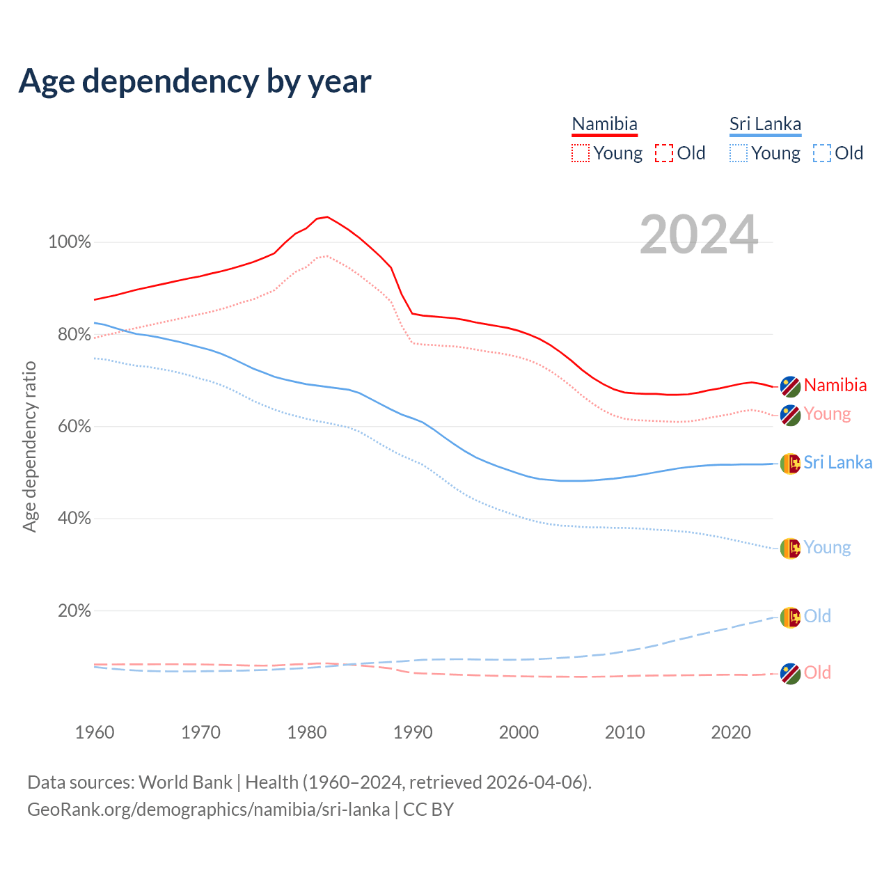 - Namibia is ranked 147/196 by median age (oldest to youngest) vs 81/196 for Sri Lanka.