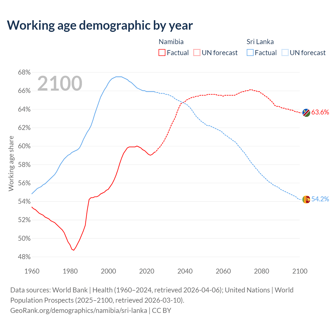 Median age Namibia vs Sri Lanka, 1960-2100