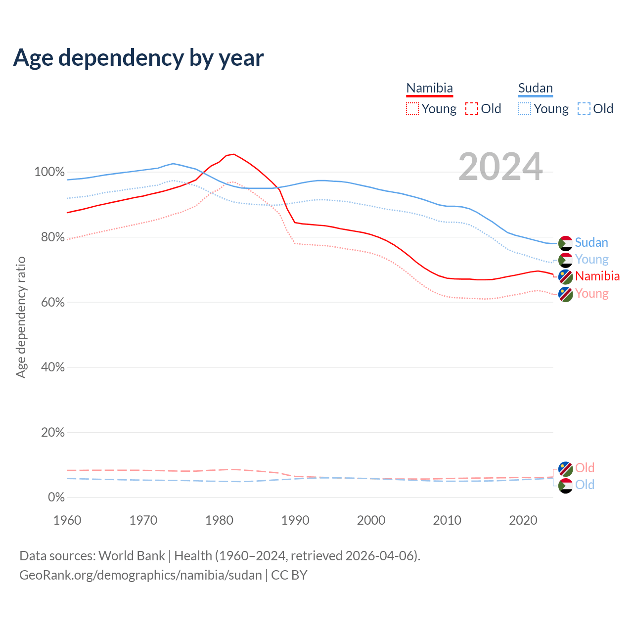 - Namibia is ranked 147/196 by median age (oldest to youngest) vs 172/196 for Sudan.