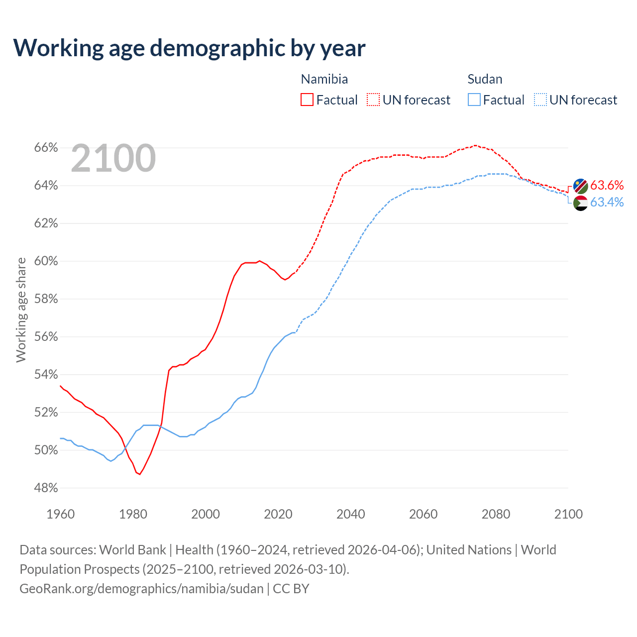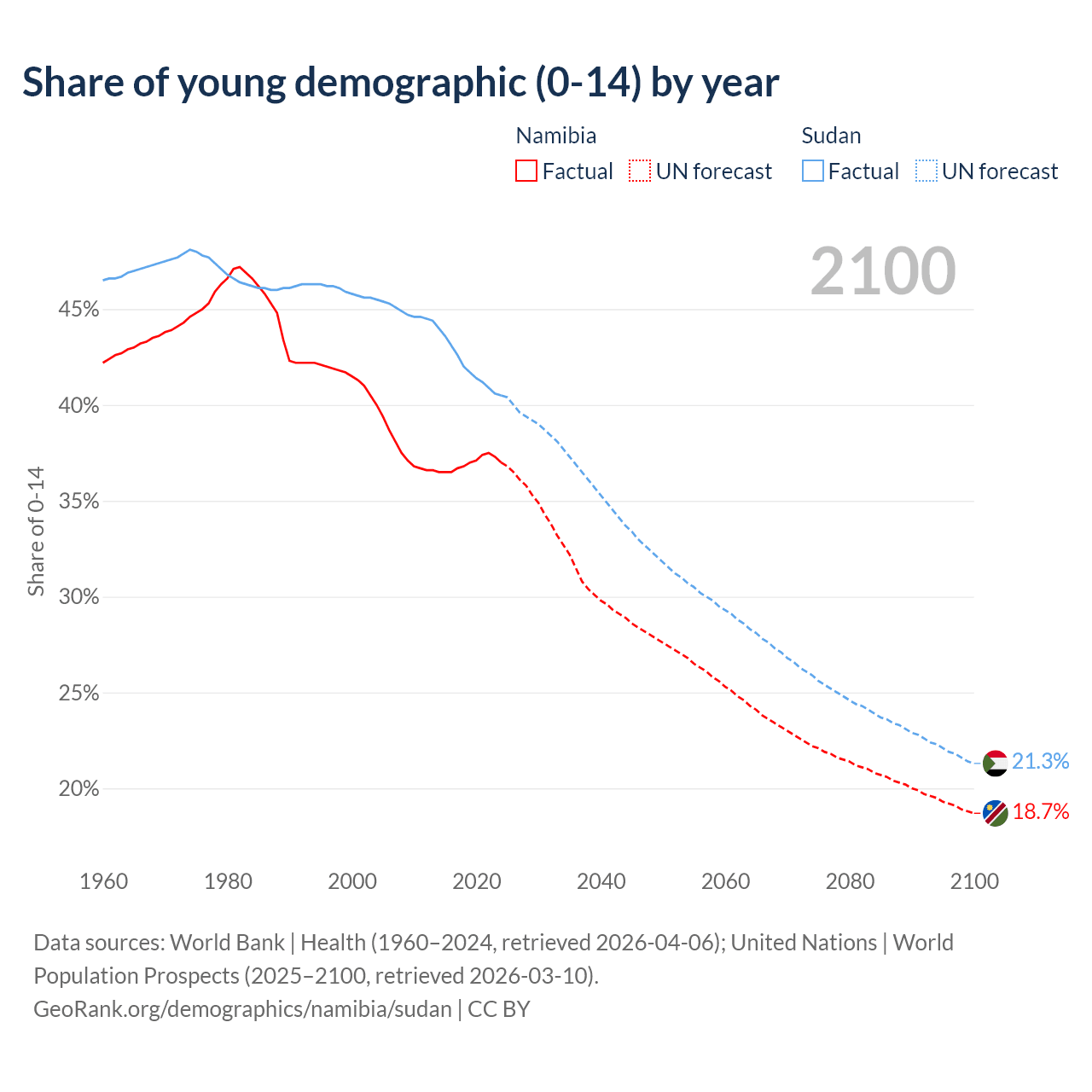 Median age Namibia vs Sudan, 1960-2100