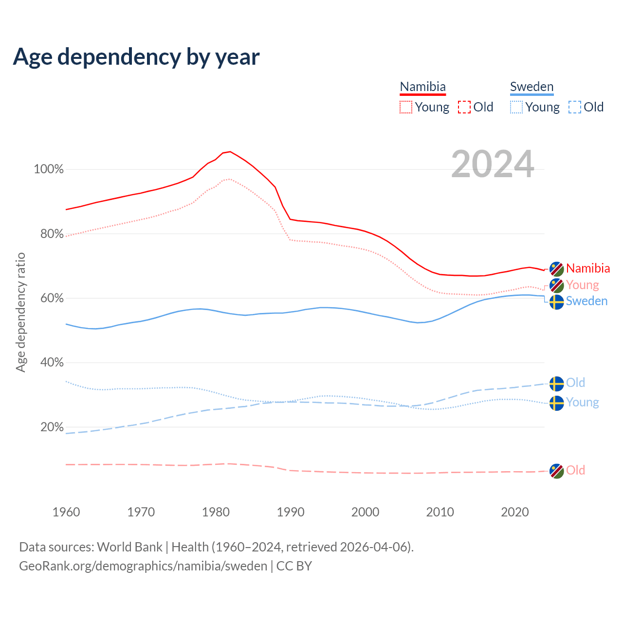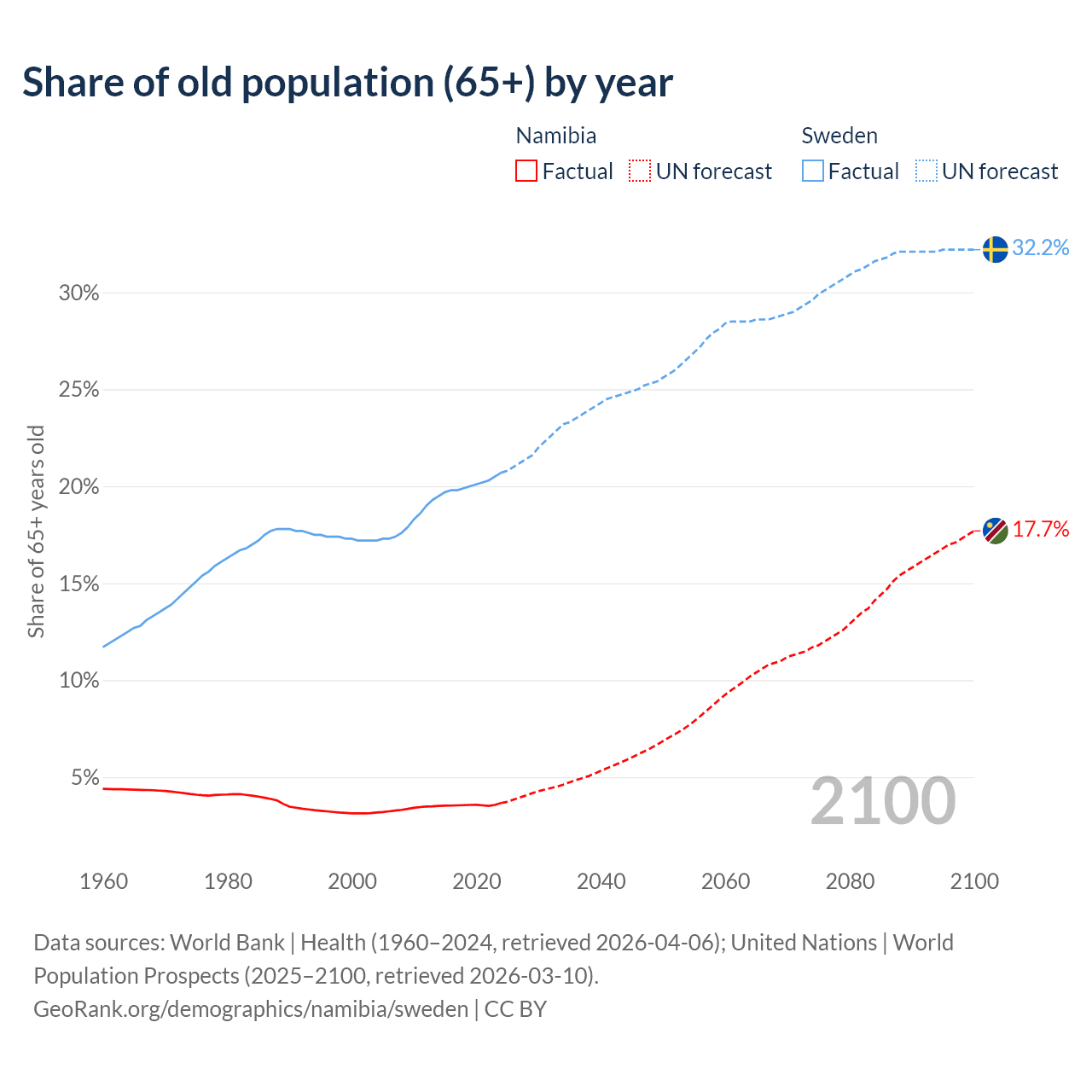 The share of older people aged 65 and over is 3.67% in Namibia and 20.7% in Sweden. Life expectancy in Namibia compared to Sweden .