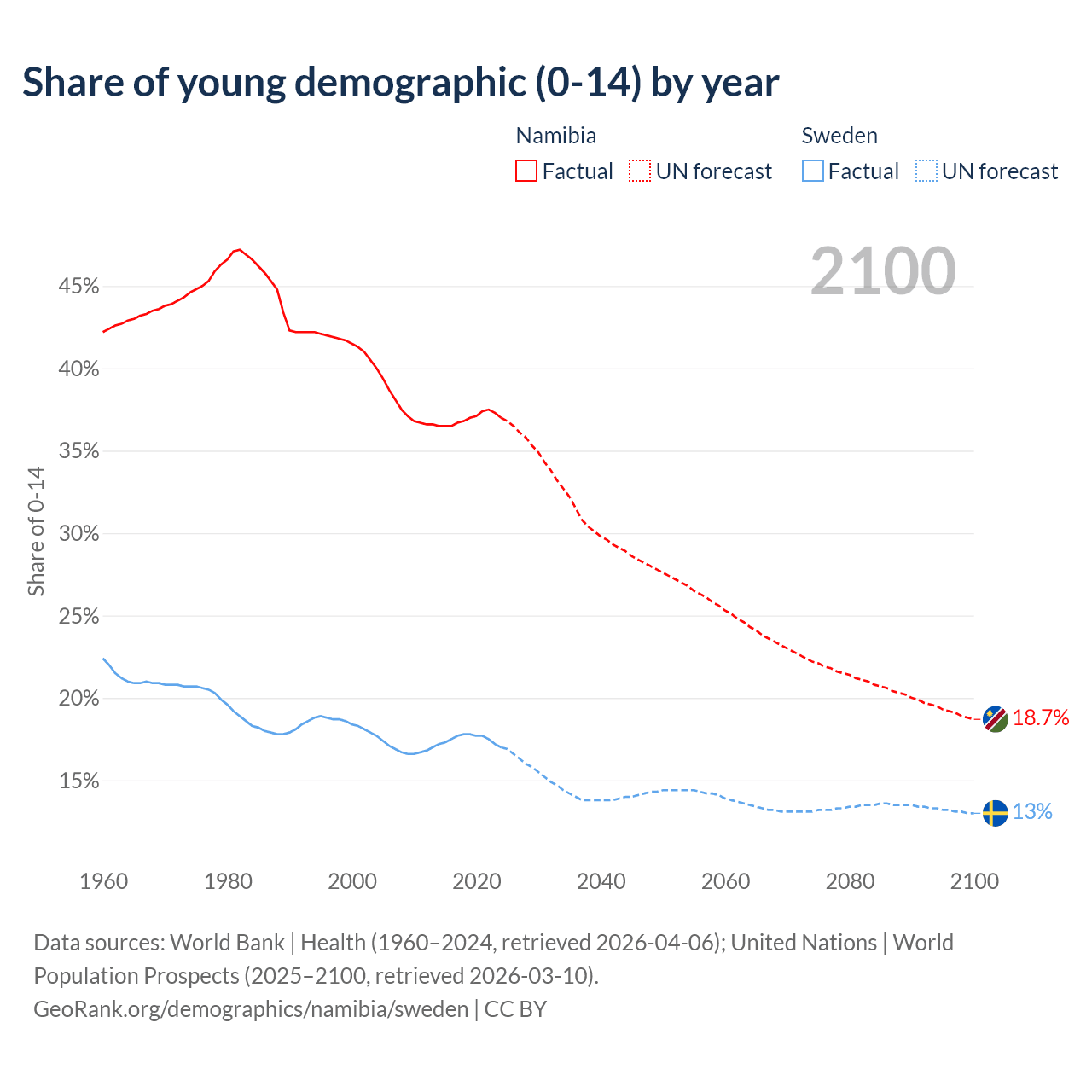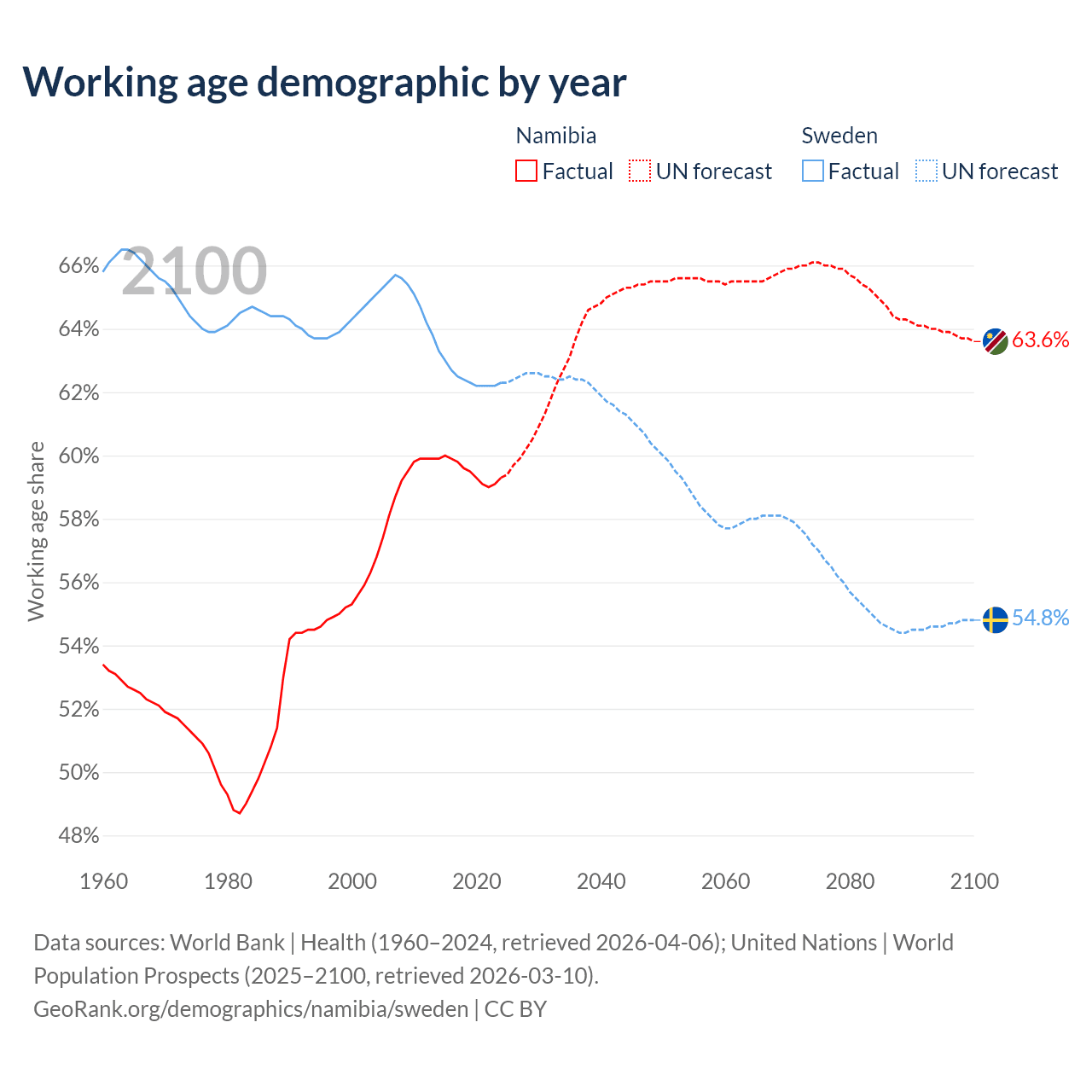 Median age Namibia vs Sweden, 1960-2100